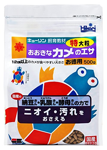 納豆菌・乳酸菌・酵母菌の力でニオイ・汚れをおさえる<br>◆商品名:ヒカリ (Hikari) おおきなカメのエサ 特大粒 カメ用 500グラム (x 1)<br>商品紹介<br>商品紹介 甲羅12cm以上用。納豆菌・乳酸菌・酵母菌とその代謝物の力で水の臭い・汚れを抑えます。(特大粒) 原材料・成分 蛋白質:38%以上、脂質:3.0%以上、粗繊維:4.0%以下、水分:10%以下、灰分:14%以下、りん:0.8%以上 使用方法 水質によって食べる量が違いますが、1日に1回2~3分で食べきれる量を与えてください。 続きを見る<br>使用方法<br>水温によって食べる量が違いますが、1日に1回2,3分で食べきれる量を与えてください。小ガメには、1日2~3回与えてください。