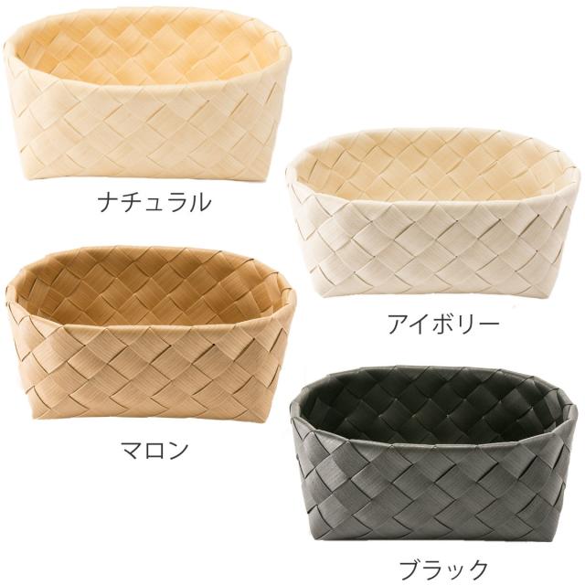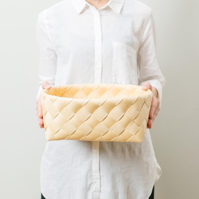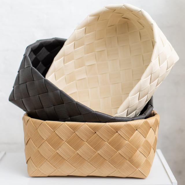 天然素材で編まれたような自然な温かみを感じるバスケットです。北欧の伝統デザイン、白樺かごをイメージして作った素材を、シンプルに斜め編みしています。職人さんたちが手編みで作るかごは、一つ一つ心のこもった優しさを感じる美しさです。