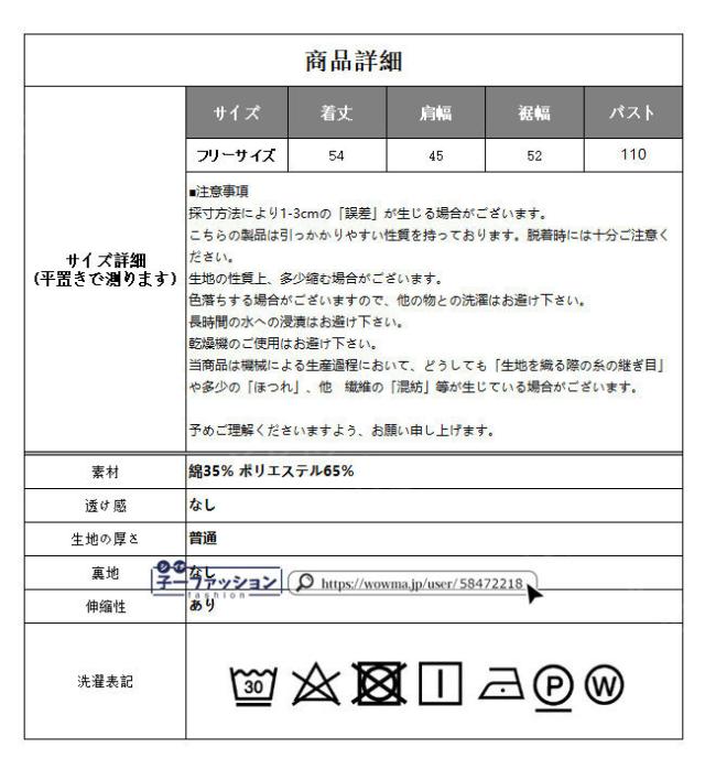 ●製品によっては、生地の特性上、洗濯時に縮む場合がございますので洗濯時はご注意下さいませ。