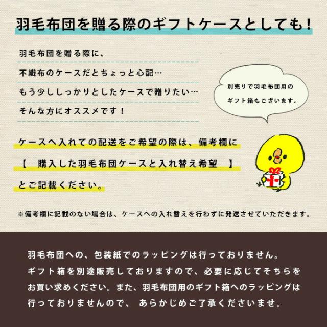 | ・ハードタイプの羽毛布団収納ケース 初期付属している収納袋よりも、しっかりとした収納ケースをお求めの方に。しっかりとした板が入った、ハードタイプの羽毛布団収納ケースです。 | |