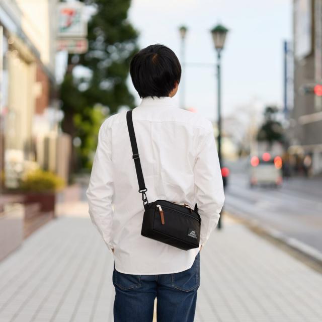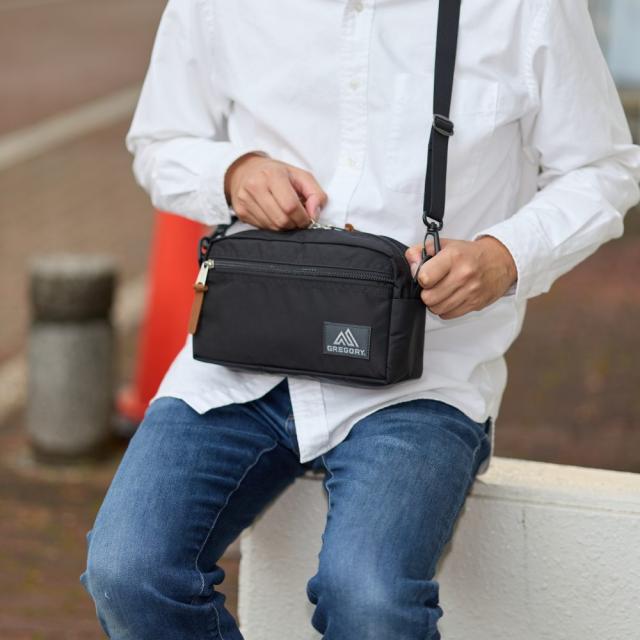 グレゴリーのコンパクトなショルダーバッグ。スリムタイプのショルダーバッグですが、500mlペットボトルや長財布などがピッタリ収納可能です。