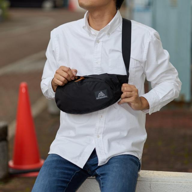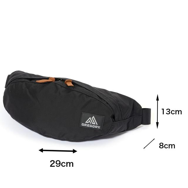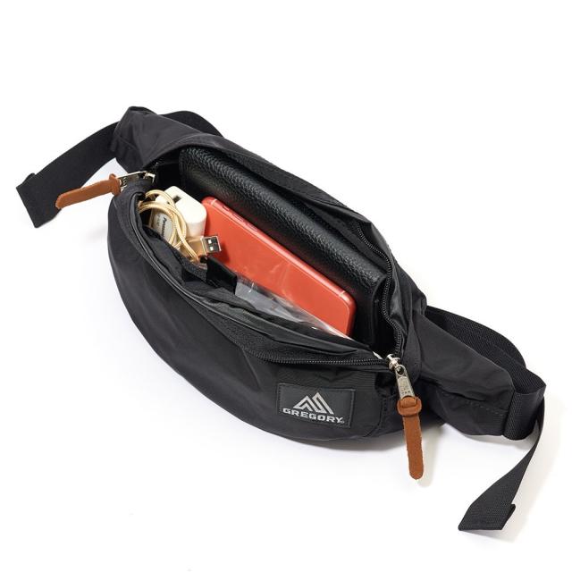グレゴリーのコンパクトタイプのウエストバッグ。内部には貴重品用のメッシュジッパーポケットとフロント側のオープンポケットがあります。スリムタイプのウエストバッグですが、500mlペットボトルや長財布などがピッタリ収納可能です。
