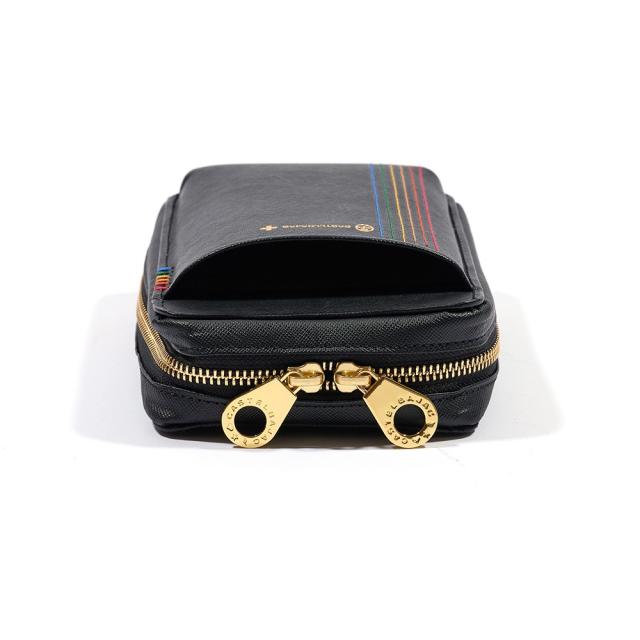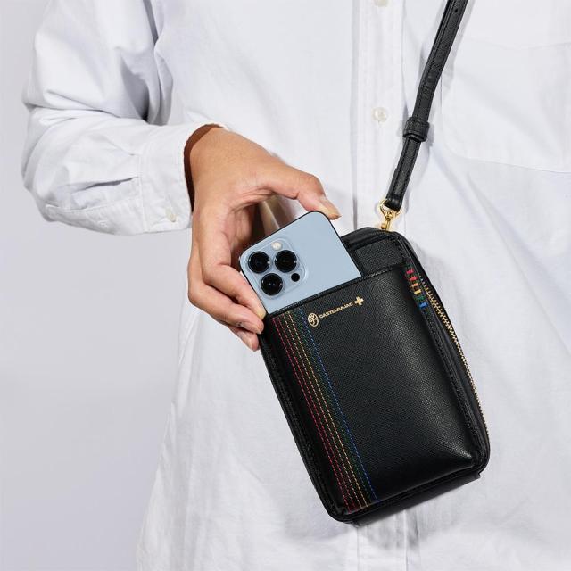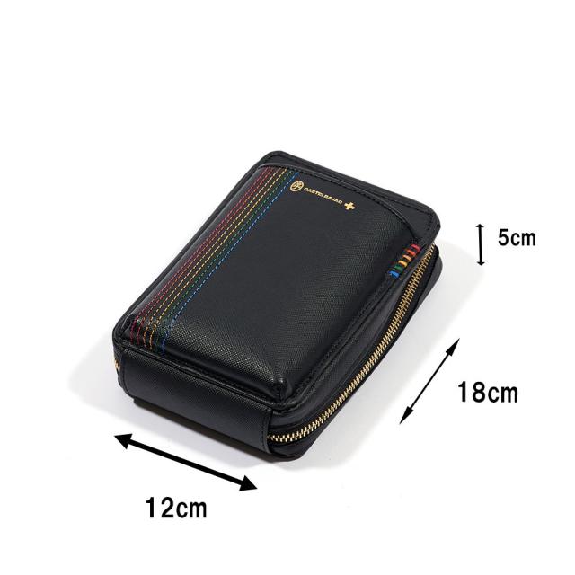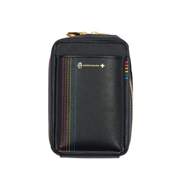 カステルバジャックで使用される6色のイメージカラーを飾りステッチと手かがりステッチで表現したシェストシリーズのスマホショルダー。光沢のあるゴールド色ファスナー、金具そしてネーム表現と、小銭入れの裏地にもゴールド色のサテン生地を使用し、ユニセックスな感覚に仕上がっています。