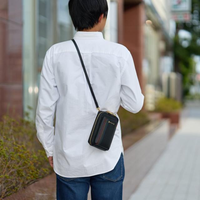 マチ幅をしっかり取った厚めのスマホショルダー。メイン収納部は2つに分かれており、仕分けもしやすいアイテムです。中のゴムバンドにはペンやイヤホンのコードなどを挿しておくこともできます。