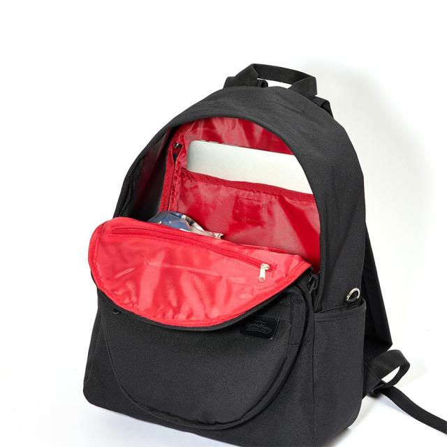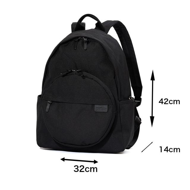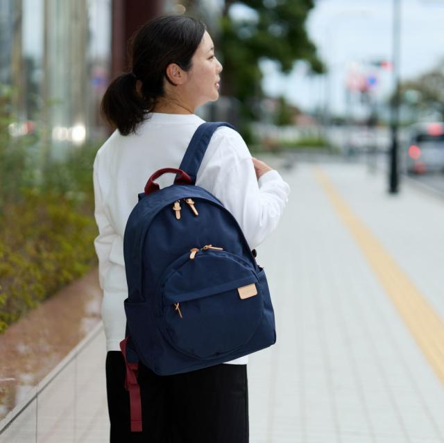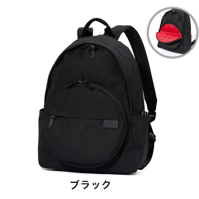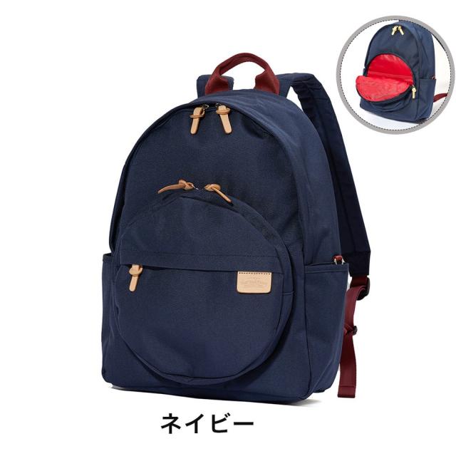 Heart Made FactoryのMARU PACK(マルパック)シリーズ。バッグ自体が丸型のシリーズでしたが、本モデルはベーシックな本体のシルエットに丸型のポケットを合わせた遊びごころたっぷりのアイテム。個性的な丸型ポケットは珍しく、周りと差別化できるポイントです。小物ポケットも豊富で、背面のファスナーからもメイン収納部へアクセス出来ます。