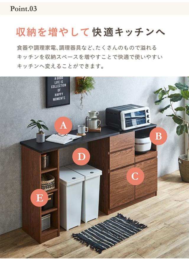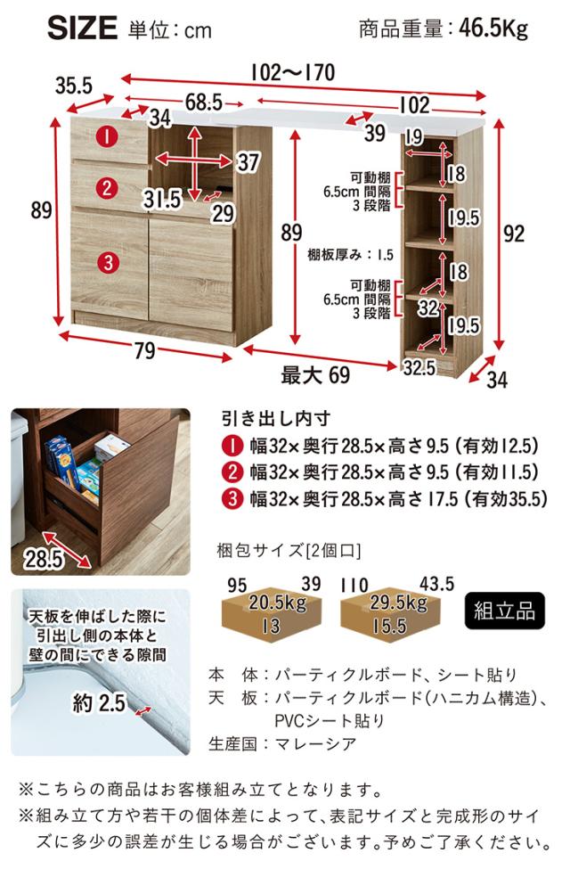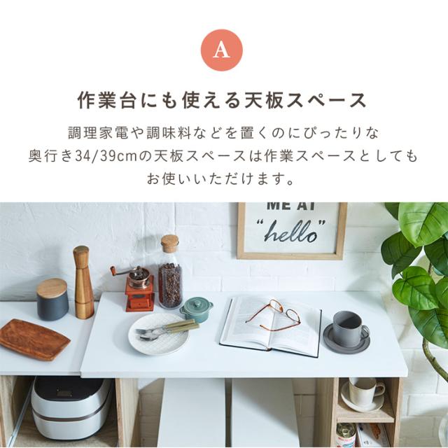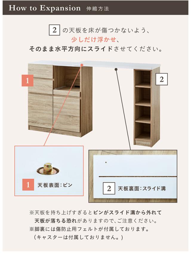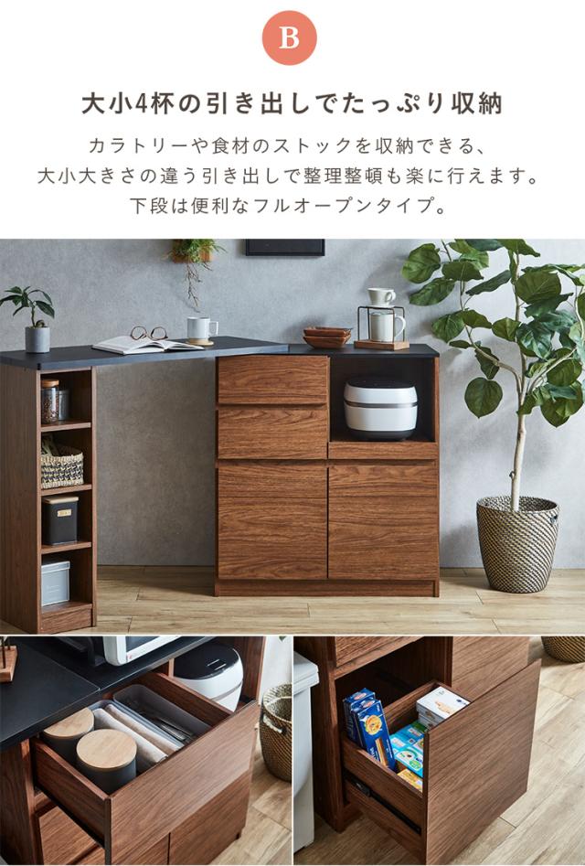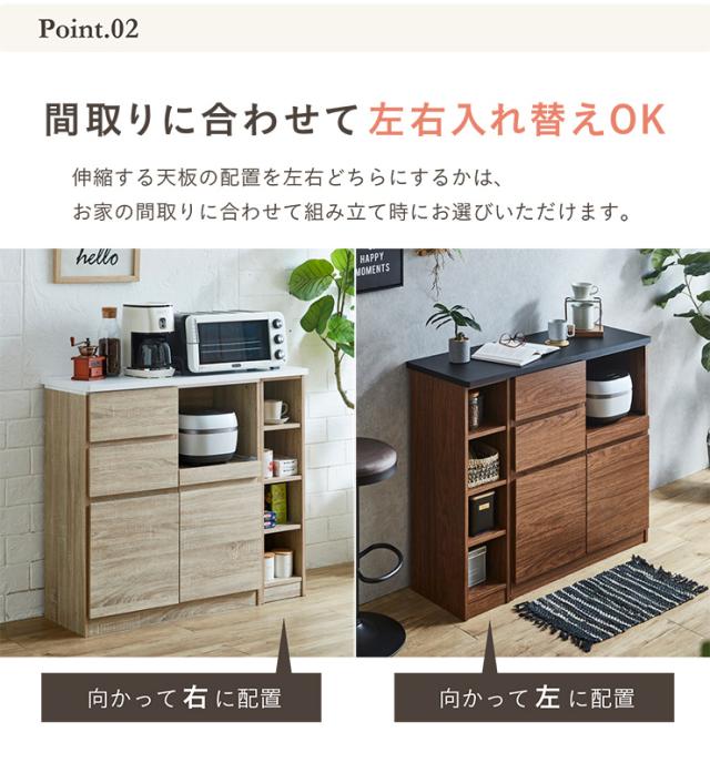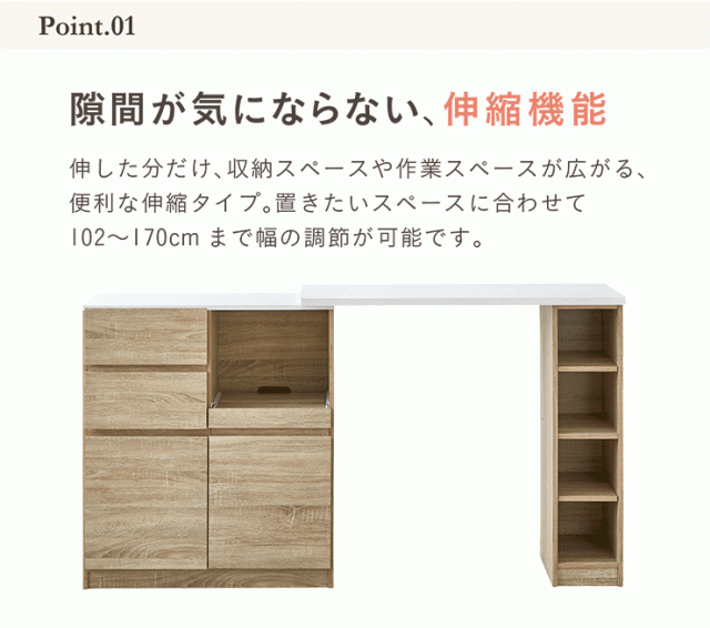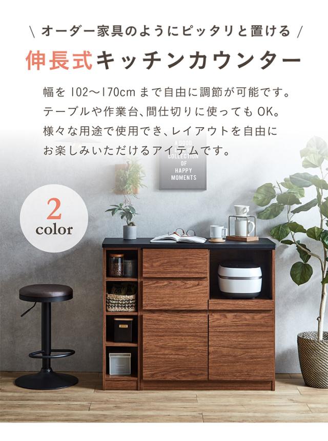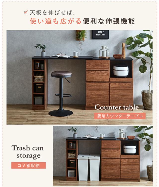 伸長式キッチンカウンター Chaton(シャトン) 2色対応 幅102-170cm キッチンボード 食器棚 カップボード キッチン収納 キッチン 棚 ゴミ箱上収納 キッチンラック キッチンキャビネット ごみ箱収納 引き出し収納 木製
