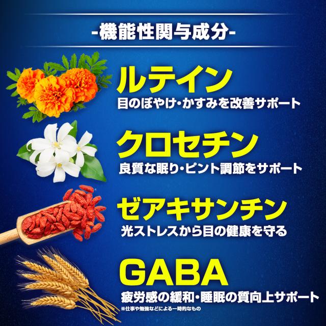 - 目のケア系サプリはいろいろありますが、成分バランスが良さそうだったので試しました。 飲み始めてから、夕方の重だるさが以前より感じにくくなった気がするので続けていきたいと思います。