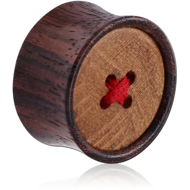ローズウッドで作られたダブルフレアアイレットにチークウッドで作られた4穴ボタンのデザインをセットしたユニークなボディーピアス。