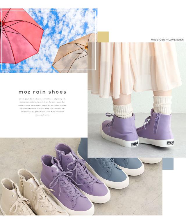 モズ moz レインシューズ スニーカー 防水 ハイカット レインシューズ レディース おしゃれ レインスニーカー サイドファスナー 蒸れにくい 履きやすい 歩きやすい 雨靴 女性 ブランド 黒 白 ブルー パープル ブラウン カーキ グレー 6002