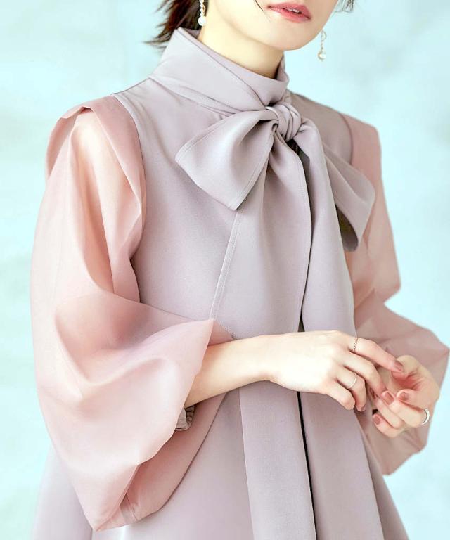 アレンジの効く共地ボウタイがラグジュアリーな印象に。
