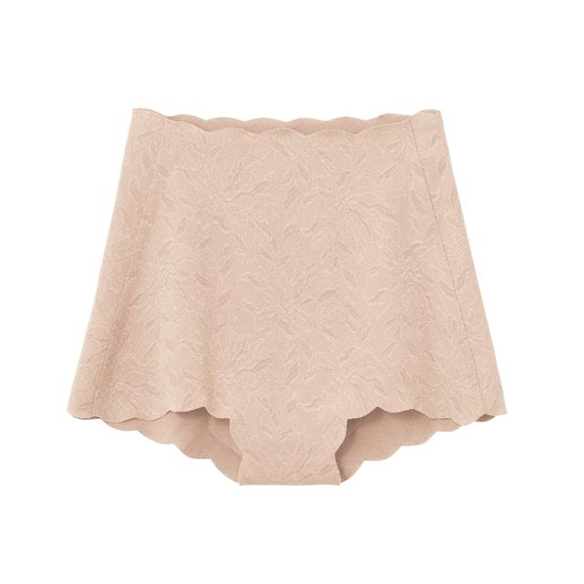 生地端にゴムが無いカットオフのストレッチレースを使用しています。肌あたりが柔らかな素材なので、レース特有の凹凸を感じにくく、フラットな着用感です。ストレッチレースのほどよいパワーがカラダにフィットしますが、肌への圧迫感は少なく、おなかとヒップまわりを優しく補整します。ヒップ下に段差ができにくいので、痩せ見え効果も。カラダのラインをひろうボトムを着用する時にもおすすめです。