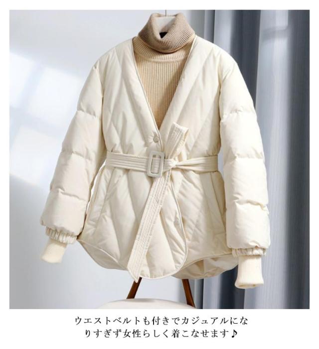 中綿 ノーカラーコート レディース 中綿コート ベルト付き Vネック リブ切り替え アウター コート 秋冬 防寒 軽量 暖かい 冬服 冬物