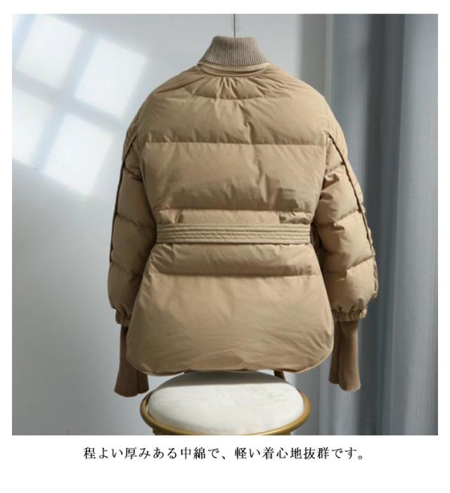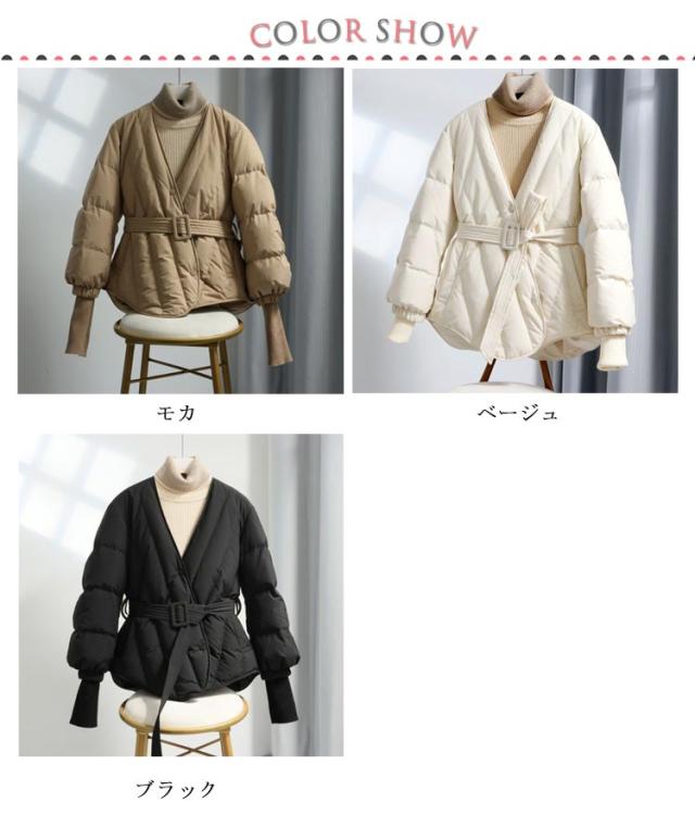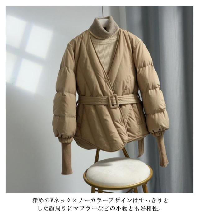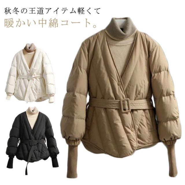 中綿 ノーカラーコート レディース 中綿コート ベルト付き Vネック リブ切り替え アウター コート 秋冬 防寒 軽量 暖かい 冬服 冬物