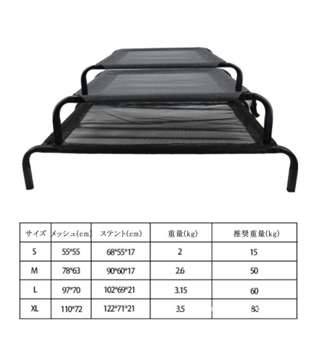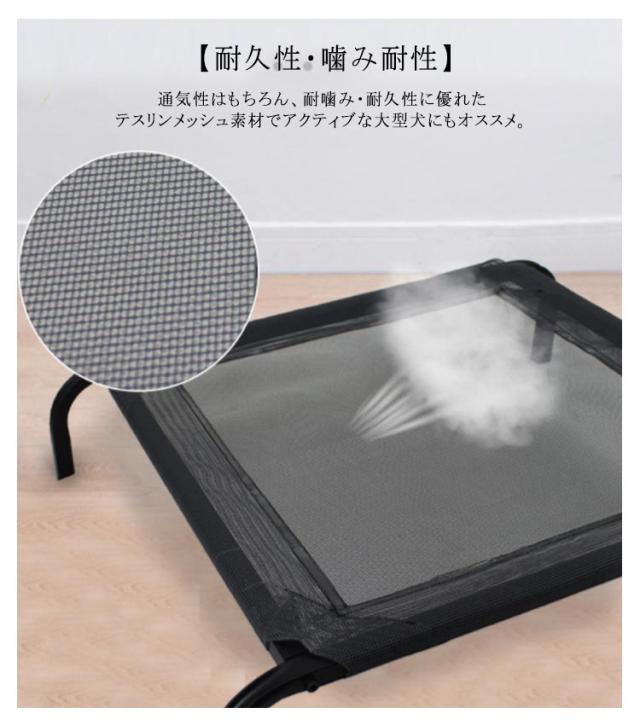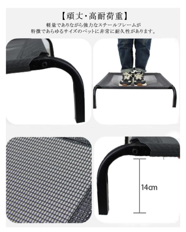 | 脚つきコット型ペットベッド 【通気性・湿気を防ぎ】 少し高さある脚付きのおかげで、ペットが汚れた床との接触を防げ、湿気や匂いがこもりにくくノミ、ダニ、カビからもペットを守ります。 布は拭いたり、清掃したり、速乾性があり、メンテナンスが容易です。 【頑丈・高耐荷重】 軽量でありながら強力なスチールフレームが特徴であらゆるサイズのペットに非常に耐久性があります。 XLサイズの犬用ベッドは最大100kgの耐荷量があり強度テスト済みです。 【耐久性・噛み耐性】 通気性はもちろん、耐噛み・耐久性に優れたテスリンメッシュ素材でアクティブな大型犬にもオススメ。 【丸洗い・いつでも清潔に】 全体が錆びにくく汚れに強く、水洗い・丸洗いできるのでお手入れも簡単です。 いつでも洗ってペットと飼い主の健康を守ることができます。 | |