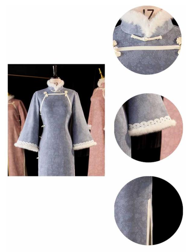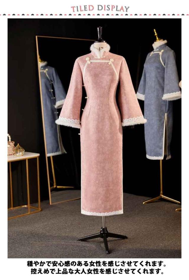 チャイナ ドレス ワンピース 柄 服 中華 チャイニーズ スリット 高級 秋 冬 長袖 レディース チャイナドレス 韓国 和柄 花柄 スタンドカラー ミドル丈 可愛い ファー 和風 レトロ タイトめ フレア袖 セクシー コスプレ 個性的 目立つ 高級感 刺繍 きれいめ 厚手 アイボリー