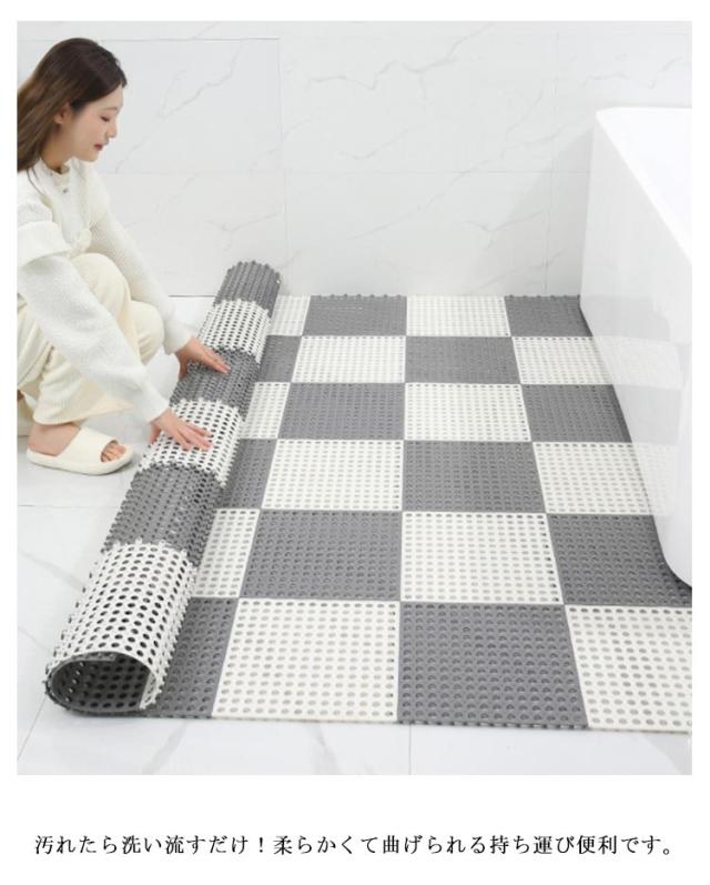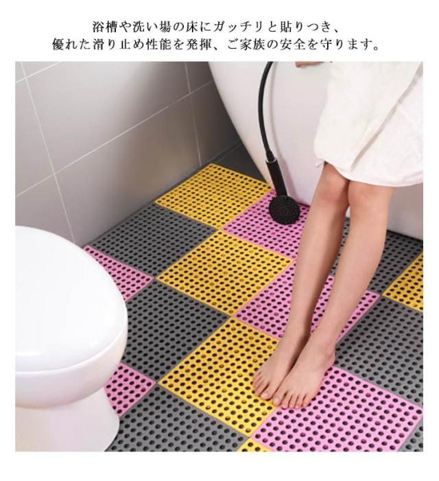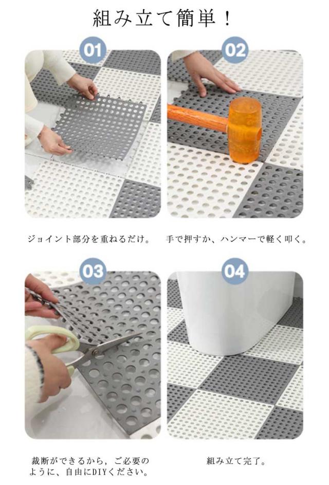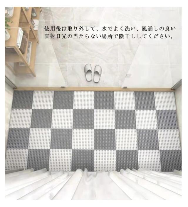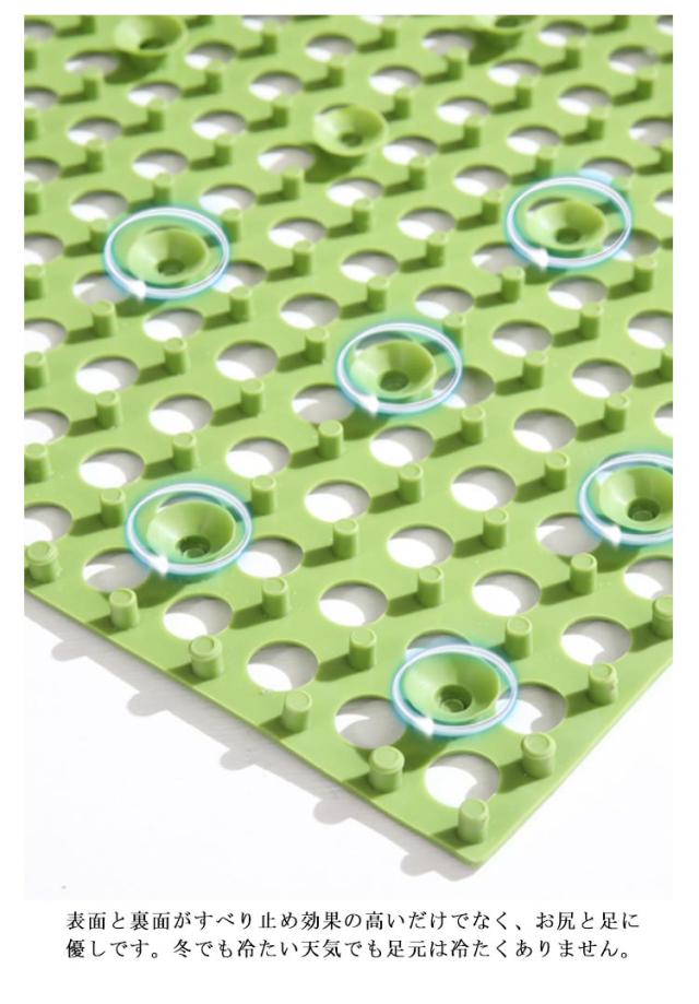 | 【6枚セット】【お風呂滑り止めマット】【30cm×30cm】 浴槽や洗い場の床にガッチリと貼りつき、優れた滑り止め性能を発揮、ご家族の安全を守ります。 穴が多くあるので水切れがよく、浴槽に掛けて干すだけで乾きが速いです。 優れた防カビ・抗菌効果、超耐久性があり、常に清潔で安心してご利用頂けます。 表面と裏面がすべり止め効果の高いだけでなく、お尻と足に優しです。冬でも冷たい天気でも足元は冷たくありません。 汚れたら洗い流すだけ!柔らかくて曲げられる持ち運び便利です。 使用場所:キッチン、バスルーム、寝室、リビングルーム、玄関など 【お手入れ簡単】使用後は取り外して、水でよく洗い、風通しの良い直射日光の当たらない場所で陰干ししてください。底面に凹凸加工があったり、木や石、タイルなど表面が滑らかでない素材の浴槽にはご使用になれない場合があります。 組み立て簡単! ジョイント部分を重ねるだけ。 手で押すか、ハンマーで軽く叩く。 裁断ができるから,ご必要のように、自由にDIYください。 組み立て完了。 | |