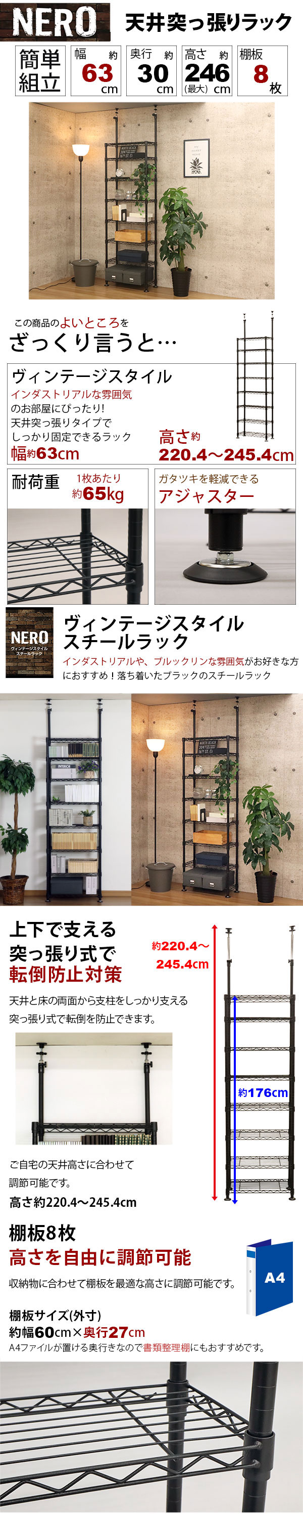 天井突っ張り 本棚 スチールラック8段 奥行き30cm 頑丈 耐荷重65kg(棚板1枚) コミックラック 漫画本棚 転倒対策 おしゃれなヴィンテージ風 幅63cm 奥行30cm 高さ220cm〜高さ245cm ブラック(黒) アジャスター付き ブルックリンスタイル インダストリアル風 キッチン NERO-TP60