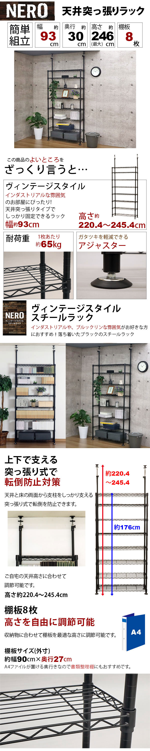 商品名:天井突っ張り 本棚 スチールラック8段 奥行き30cm 頑丈 耐荷重65kg(棚板1枚) コミックラック 漫画本棚 転倒対策 おしゃれなヴィンテージ風 幅93cm 奥行30cm 高さ220cm〜高さ245cm ブラック(黒) アジャスター付き ブルックリンスタイル インダストリアル風 キッチン NERO-TP90 リビング ゴミ箱収納