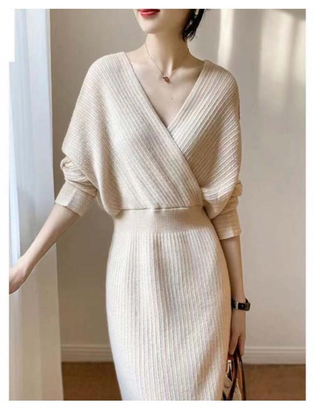 ニットワンピース vネック タイト ワンピース 長袖 春 秋 姫系 ロングワンピース ひざ下 パーティドレス お嬢様 セクシー 上品 二次会 結婚式 韓国ファッション