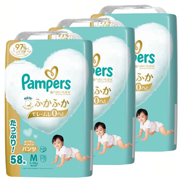 紙おむつ ベビー用品 パンツ式 (3個セット)パンパース 肌へのいちばんパンツ / ウルトラジャンボ M はいはい 58枚(5-10kg) P&G ふかふか心地 肌への一番 デザイン2種類 もれ・ムレ0 まとめ買い 超吸収 Pampers 送料無料