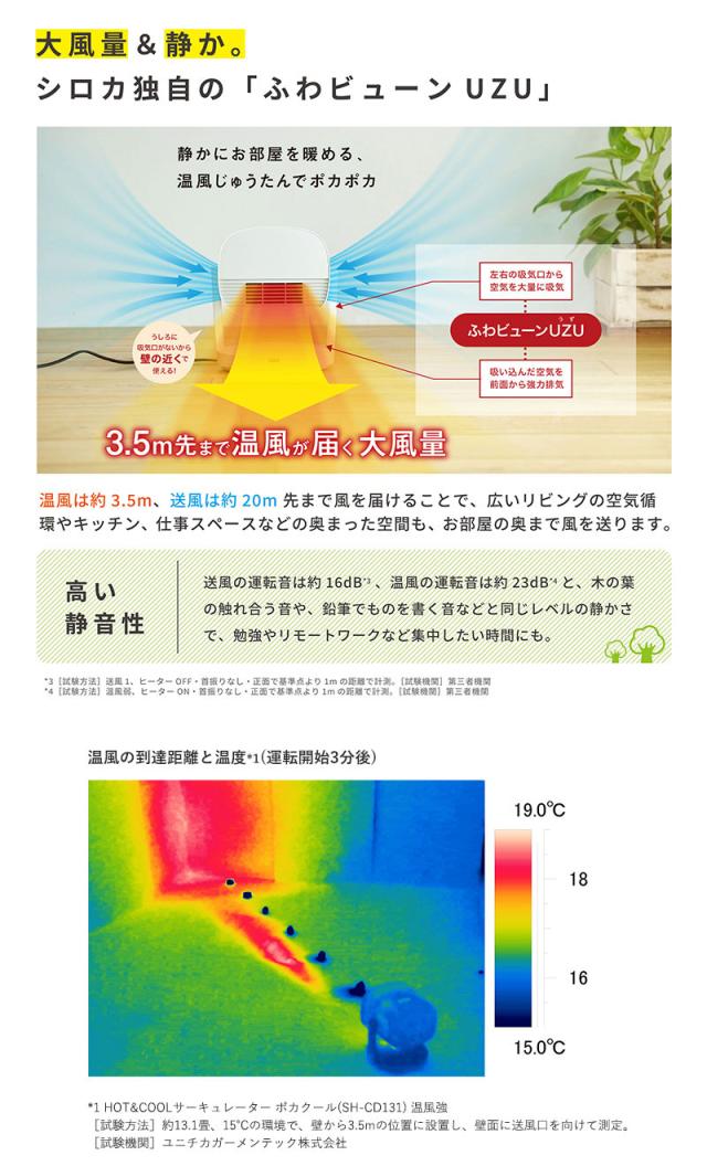 シロカ独自の「ふわビューンUZU(うず)」により、大風量と静音性を両立。睡眠を妨げないそよ風から、サーキュレーターの力強い風まで、風量を細かく調整することができます。温風は約3.5m、送風は約20m 先まで風を届けることができるので、広いリビングの空気循環やキッチンなどの長い空間、仕事スペースなどの奥まった空間も、お部屋の奥まで風を送ります。