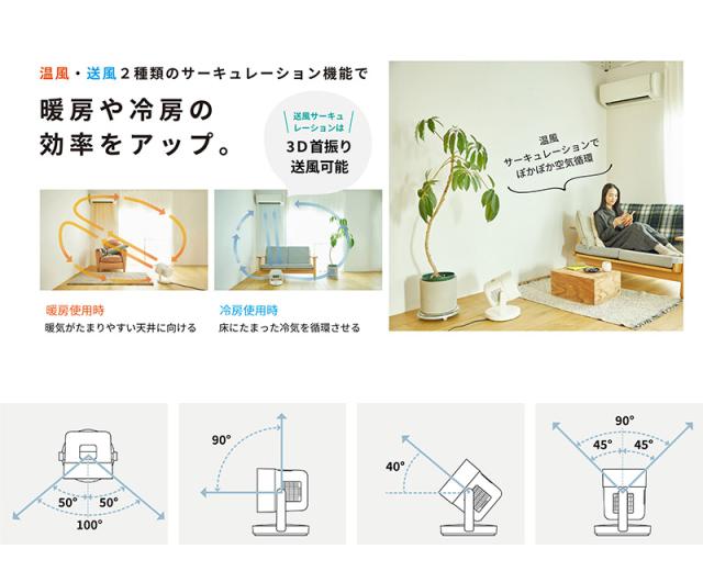 温風・送風2種類のサーキュレーション機能はエアコンと併用することで、広いリビングでもより効率的に冷気や暖気を循環させます。温風は、天井にたまった暖気に向けて風を送ることで上にたまりやすい暖気を循環させるため、上40℃の向きで固定で運転します。送風は、上下左右に動く3D首振り運転を行い、エアコンからの冷気を効率的に部屋中に循環させます。