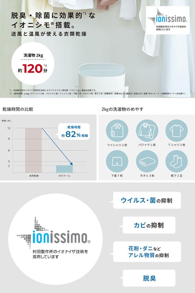 脱臭・除菌をしながら衣類を効率よく乾かす衣類乾燥モードは、村田製作所のイオナイザ技術を採用したマイナスイオン発生器「イオニシモ」を搭載。洗濯物2kgを約120分で乾燥。自然乾燥に比べて約82%乾燥時間を短縮。素早く乾燥させることで、生乾き臭も軽減します。