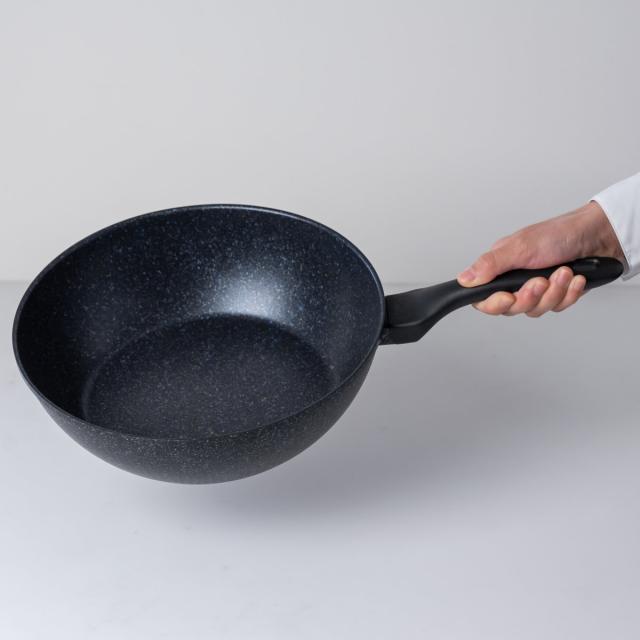 持ったときに今までにない軽さを実感していただける、軽量フライパンです。軽いから片手で楽々振っていただくことが出来ます。傾けても安定するから、調理後に食材をキレイにお皿に移せます。深型で、煮物料理を作る際にもピッタリです。