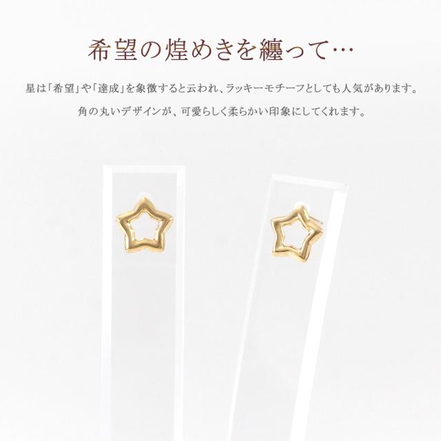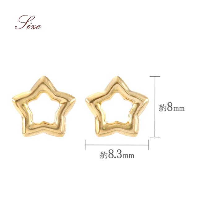 | スタッフより | 丸みのある星のモチーフがカワイイ18金ピアスです。 星(スター)は、希望や達成、チャンスを象徴すると云われ、ラッキーモチーフとしても年代問わず人気があります。 中央をくり抜き、フレームだけでデザインされた星型は、上品かつカジュアルな印象を与えます。 綺麗目からフェミニン、ボーイッシュまで、様々なコーデに合わせて楽しめるので、彼女や妻・奥様への記念日の贈り物、娘様やお友達へのお誕生日のプレゼントにもオススメです。 ・「特別な贈り物」になりますよう真心を込め丁寧にご準備させて頂きます。 (ご不明な点はお気軽にお問合せ下さい。0120-755-888(平日9時〜18時)) |