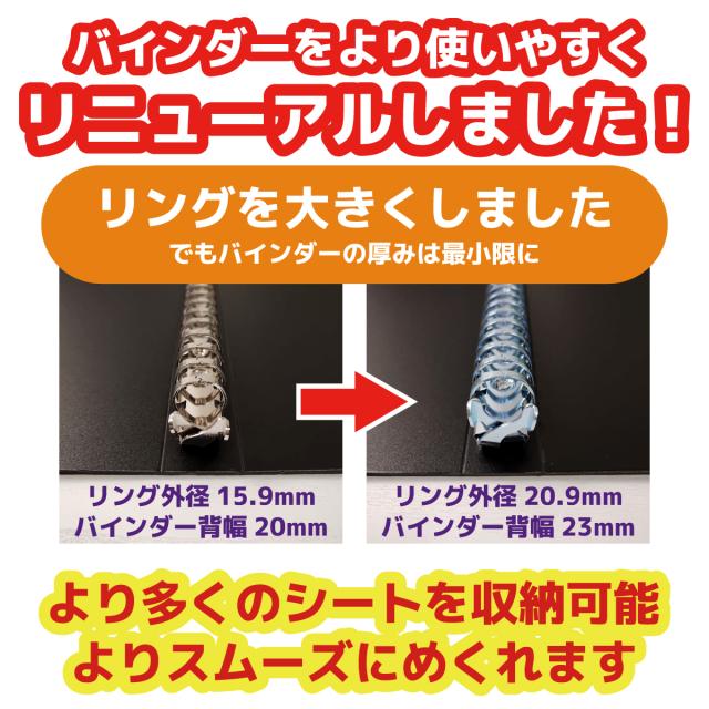 厚すぎるファイルでは、ポケットシートがヘタってしまい、長い年月保管している間に大切なシールが曲がってしまうことがあります。また、コレクションが増えてもバインダーからシートがはみ出ることのない絶妙なサイズで仕上げました。この専用バインダーはバインダーの強度を最大限高めながらも、バインダー自体が厚くなりすぎないように専用金具までこだわっています。2穴のファイルにも対応しておりますが、シール保護のためには26穴ポケットシートのご利用をお薦めします。水や油汚れにも強いPP製のバインダーは、大切なシールコレクションに見合うような質感とカラーにも開発者のこだわりが詰まっています。