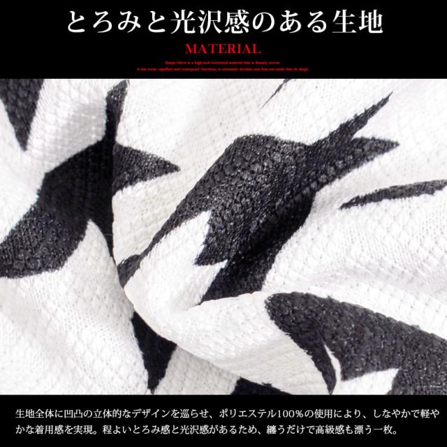 目を惹く総柄デザインだけでなく、生地全体に凹凸の立体的なデザインを巡らせたり、襟元には男らしいイタリアンカラー(立ち襟)を採用したりと、細部にまで拘りをもたせた一枚に。