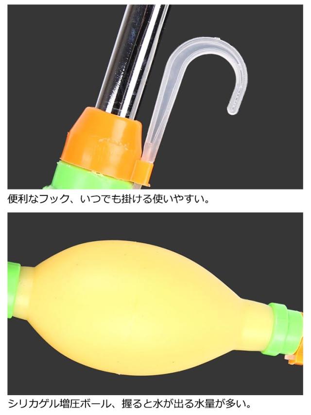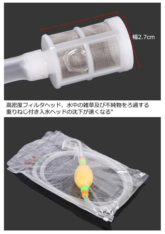 | サイズについての説明 | タイプ:2.1m(ホース1.75m) 材質:ラテックスチューブ/ステンレス鋼 特?サイフォンの原理に基づいて、高低差のあるところでも水を取れます。水量が大きく便利で長持ち、電池が不要 |