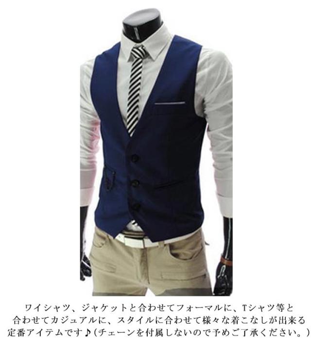 | 高級感のあるスーツ素材を使用したジレベスト 全体のラインがとてもキレイでスマートな印象に。 上品さ漂う3つボタンは開け閉めで雰囲気が変わります。 ワイシャツ、ジャケットと合わせてフォーマルに、Tシャツ等と合わせてカジュアルに、スタイルに合わせて様々な着こなしが出来る定番アイテムです♪(チェーンを付属しないので予めご了承ください。) | |