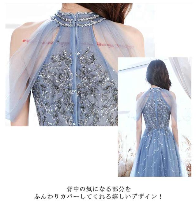 | 煌めく首元がお洒落なロングドレスです。 背中の気になる部分をふんわりカバーしてくれる嬉しいデザイン! 結婚式や演奏会などフォーマルな空間のドレスコードにおすすめです。 | |