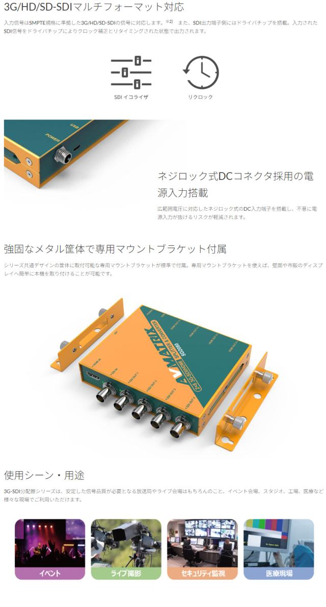 入力された3G/HD/SD-SDI信号またはHDMI信号の任意の入力信号を、SDI 4系統及びHDMI 4系統から同時に分配出力するSDI/HDMI分配器です。※1)