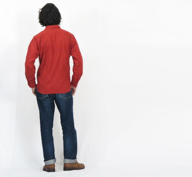 ネルシャツと言えばチェック柄が相場だが、ヴィンテージワークシャツには無地も数多く存在する。炭坑や油田の労働で汚れや油にまみれる男たちが頼りにしたのが、今回再現したような無地のネルシャツだ。本作は黄金期のワークシャツに見られる左右非対照デザインのポケットをもつヴィンテージをサンプリング。チェックにはない経年変化やパッカリングを堪能できる。
