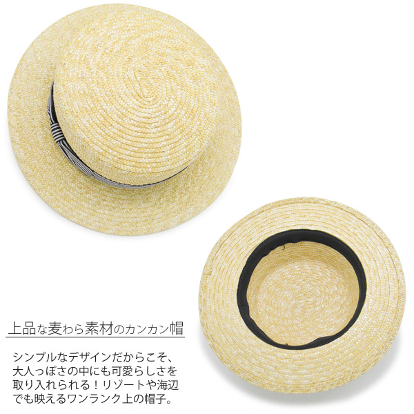 リゾートや海辺でも映える上品な麦わら素材のカンカン帽です。どんなコーデにも合わせやすく、日差しからお顔を守ってくれるので、夏のお出かけにぴったりです。シンプルなデザインだからこそ、大人っぽさの中にも可愛らしさを演出できる帽子ではないでしょうか。内側のスベリ部分にはマジックテープがあり、サイズの微調整が可能です。