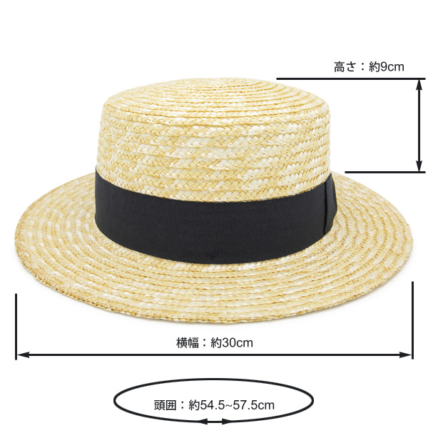 サイズ表記54.5〜57.5cm(頭囲:約54.5〜57.5cm[紐でサイズ調整可能]、高さ:約9cm、横幅:約30cm[つばも含む]、つばの長さ:約6cm)