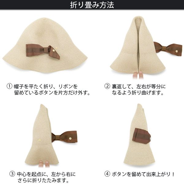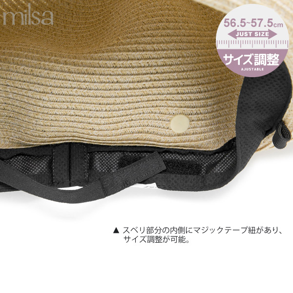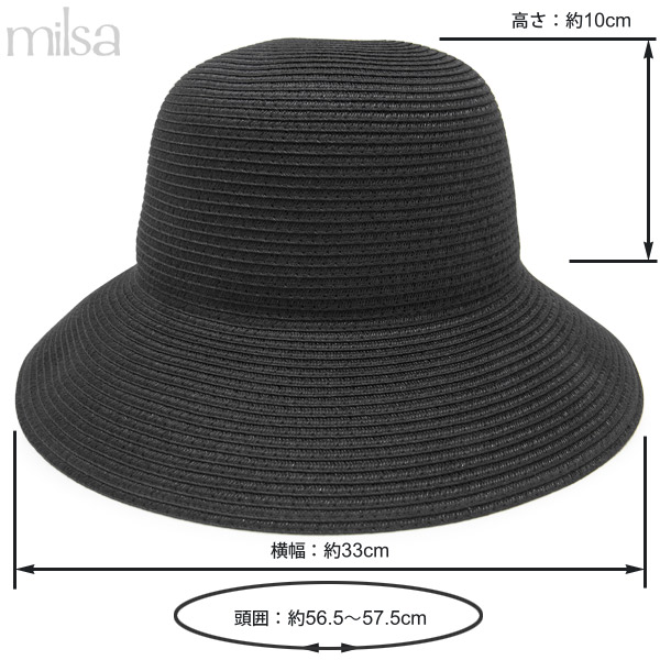 | サイズ | サイズ表記57.5cm(頭囲:約56.5〜57.5cm[紐でサイズ調整可能]、高さ:約10cm、横幅:約33cm[つばも含む]、つばの長さ:約8cm) |