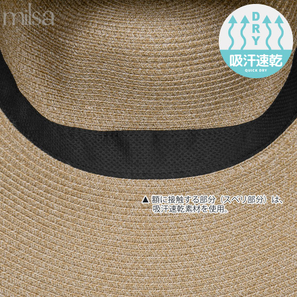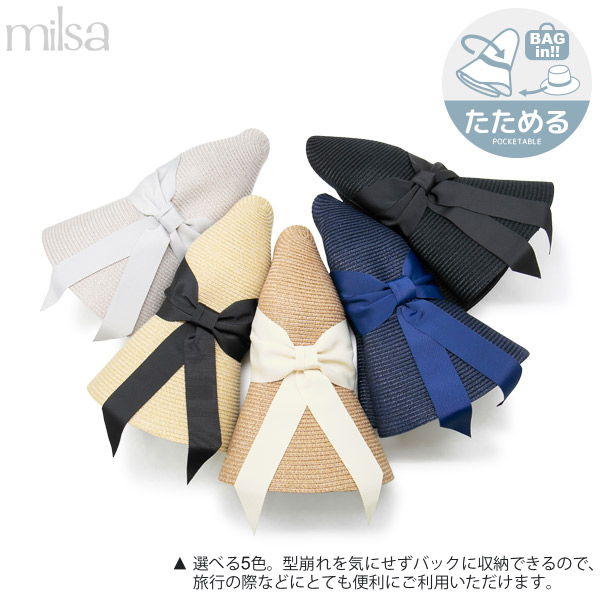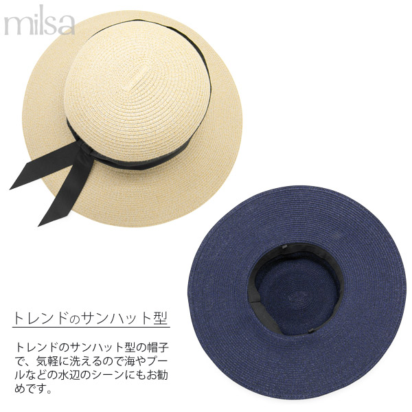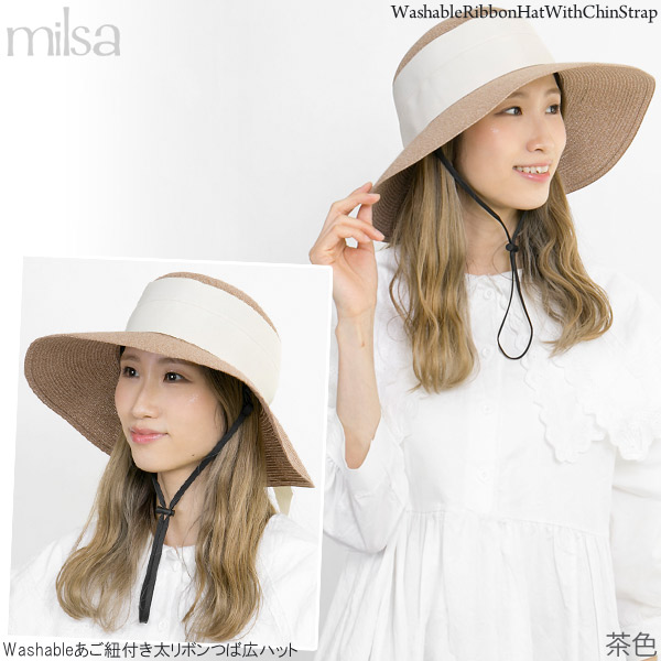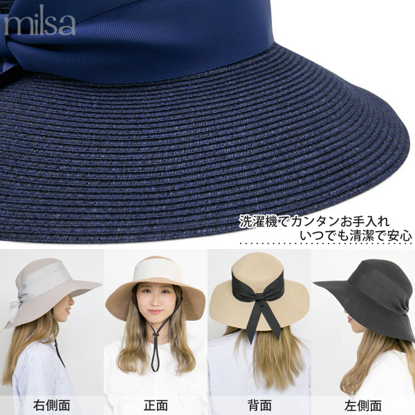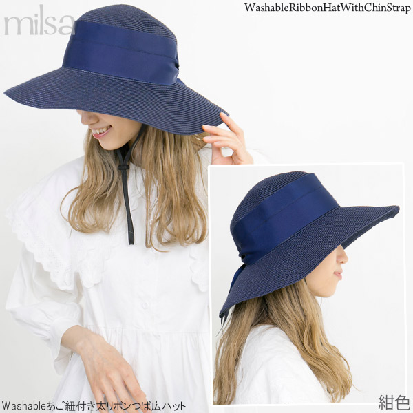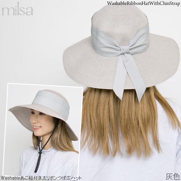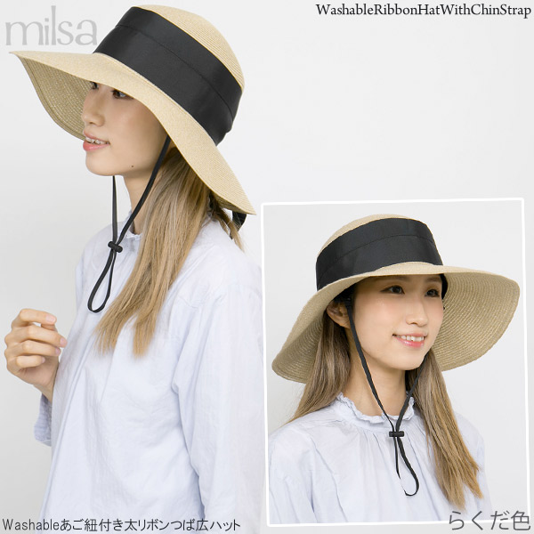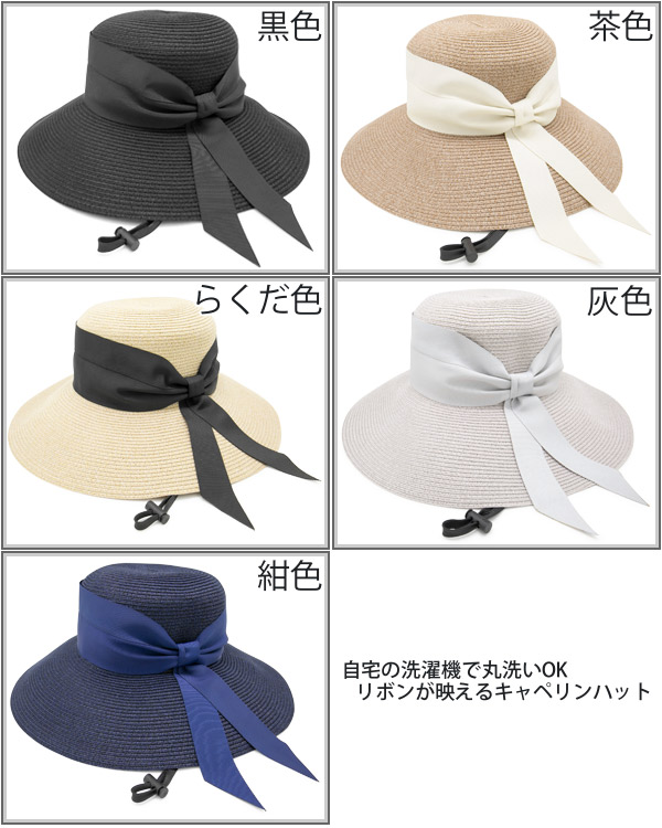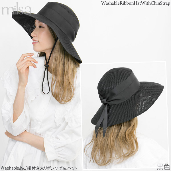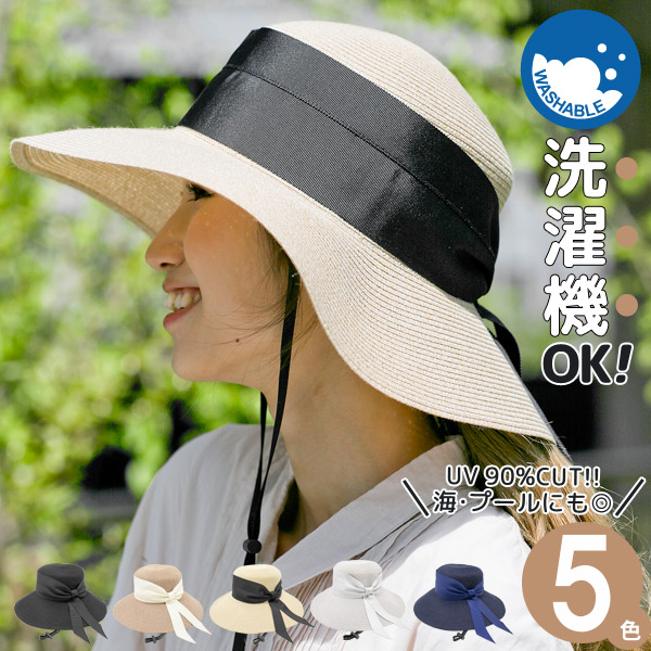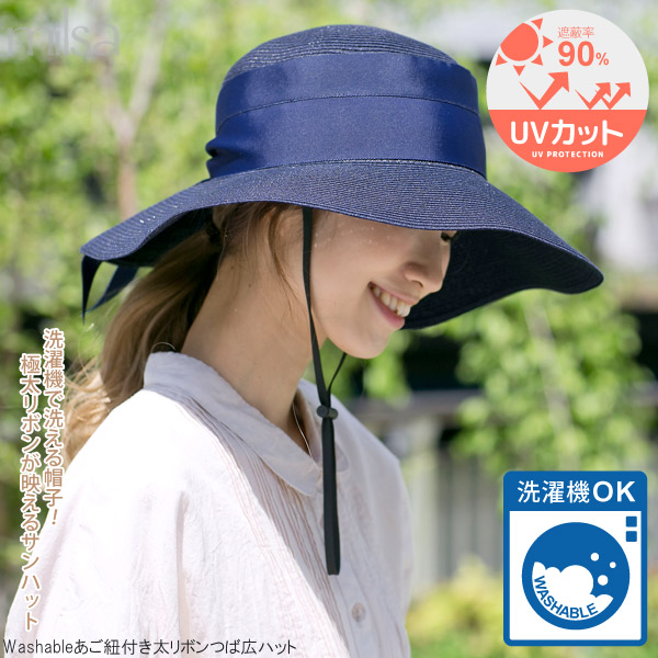 ハット レディース [メール便可] 洗濯機で洗える 麦わら帽子 春夏 UV たためる 吸汗速乾 / Washableあご紐付き太リボンつば広ハット
