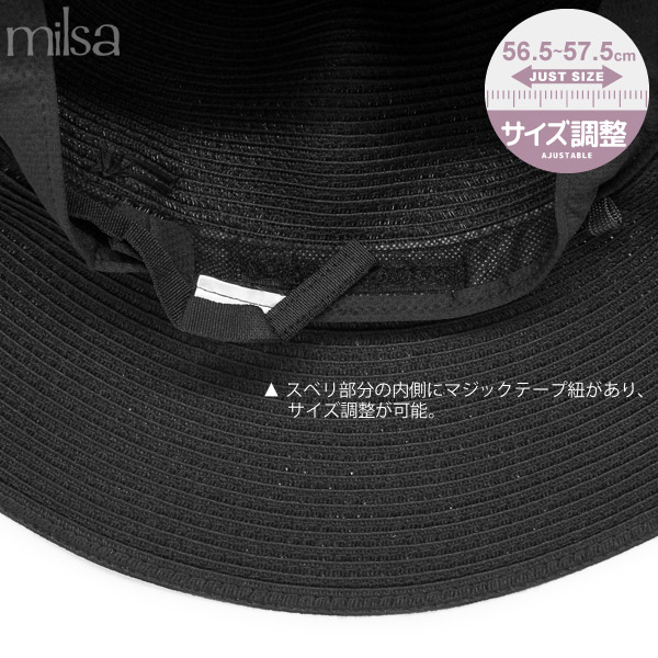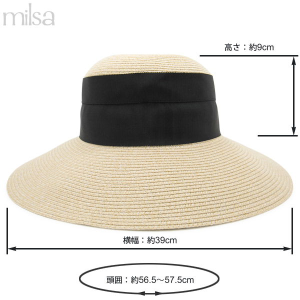 | サイズ | サイズ表記57.5cm(頭囲:約56.5〜57.5cm[紐でサイズ調整可能]、高さ:約9cm、横幅:約39cm[つばも含む]、つばの長さ:約10cm) |