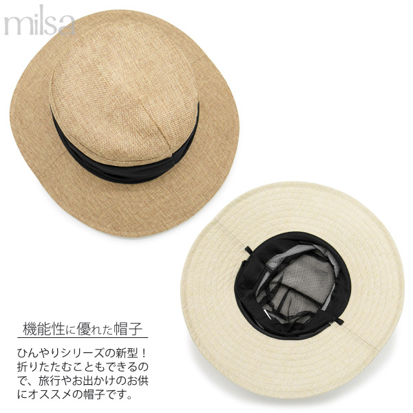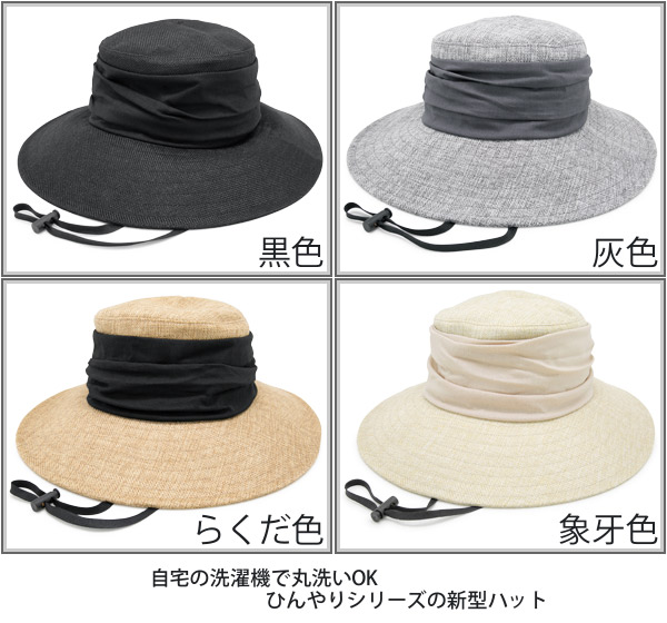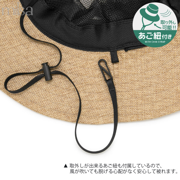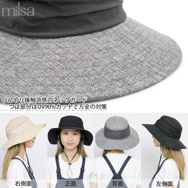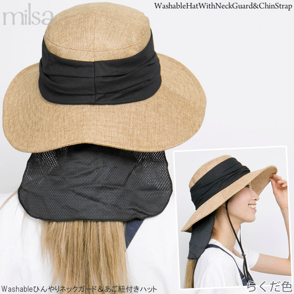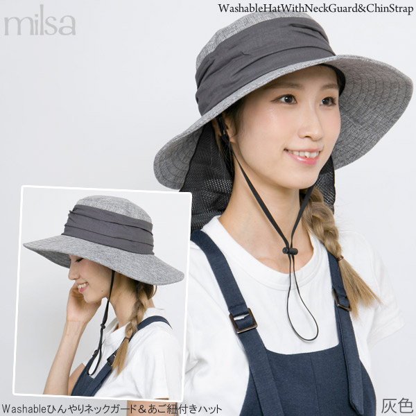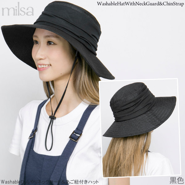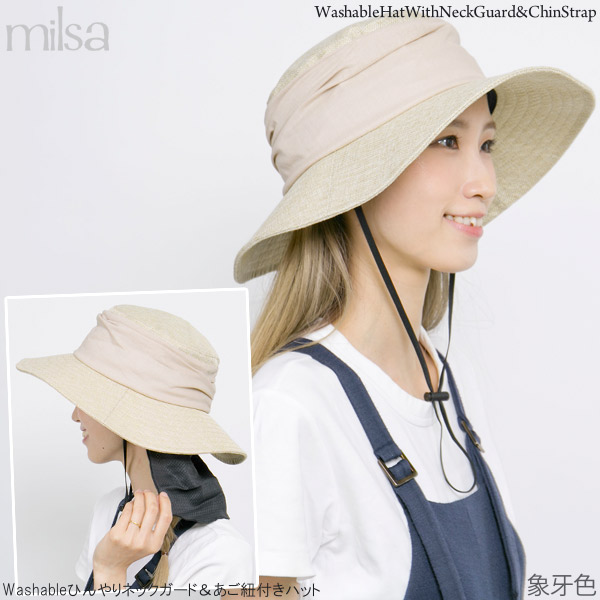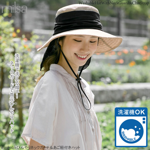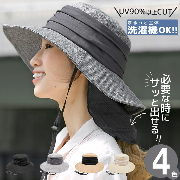 帽子 レディース [メール便可] UV 折りたたみ 夏春 サイズ調整 / Washableひんやりネックガード&あご紐付きハット