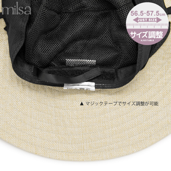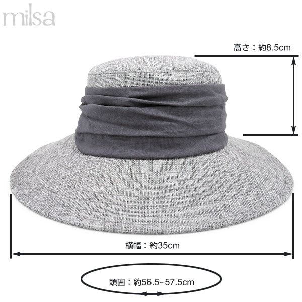 | サイズ | サイズ表記57.5cm(頭囲:約56.5〜57.5cm[紐でサイズ調整可能]、高さ:約8.5cm、横幅:約35cm[つばも含む]、つばの長さ:約9cm) |