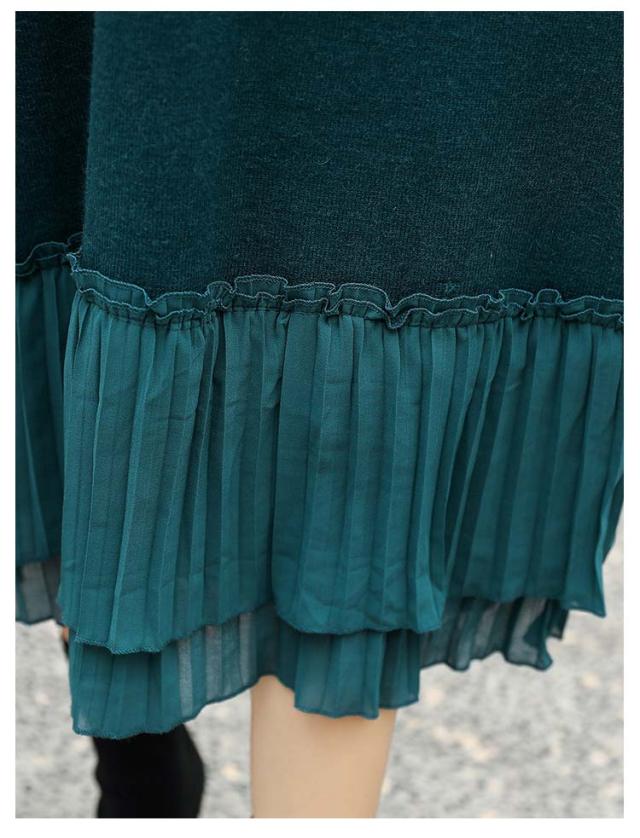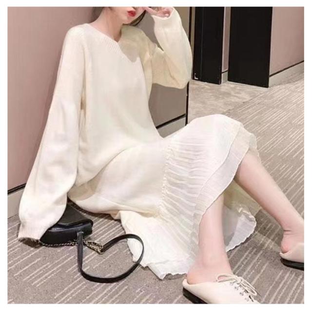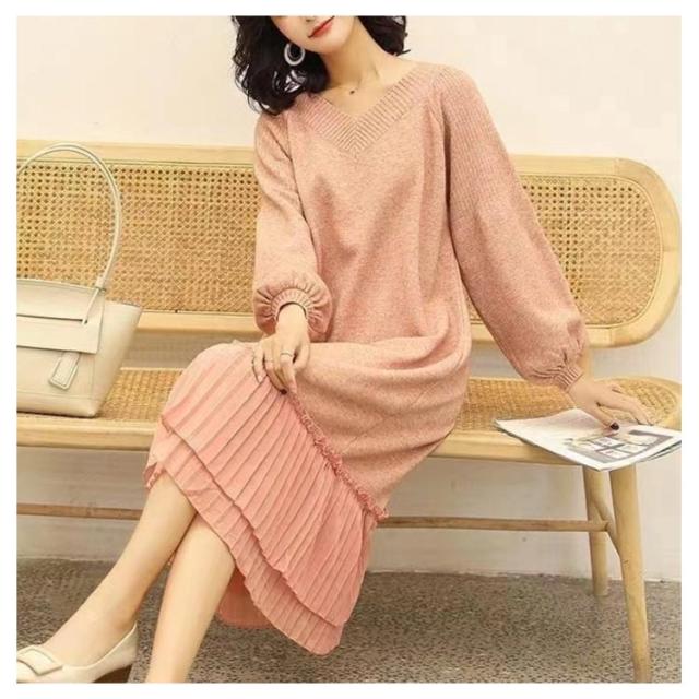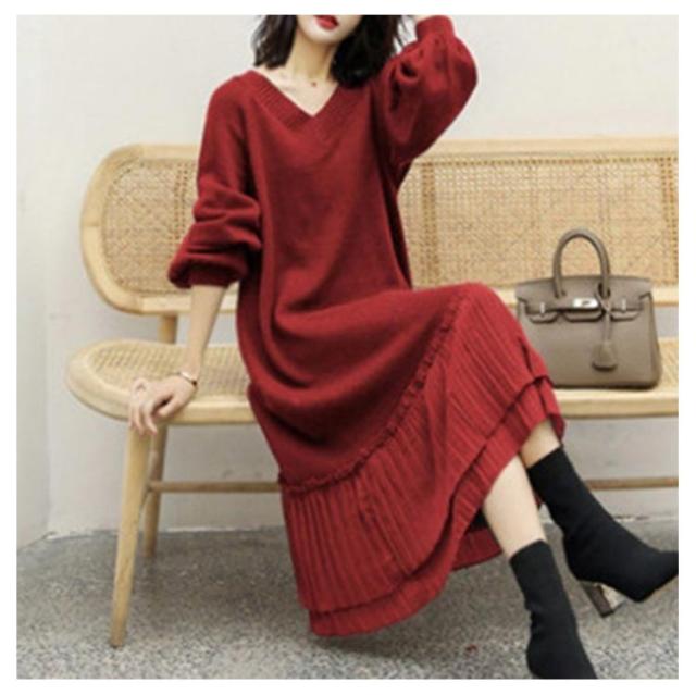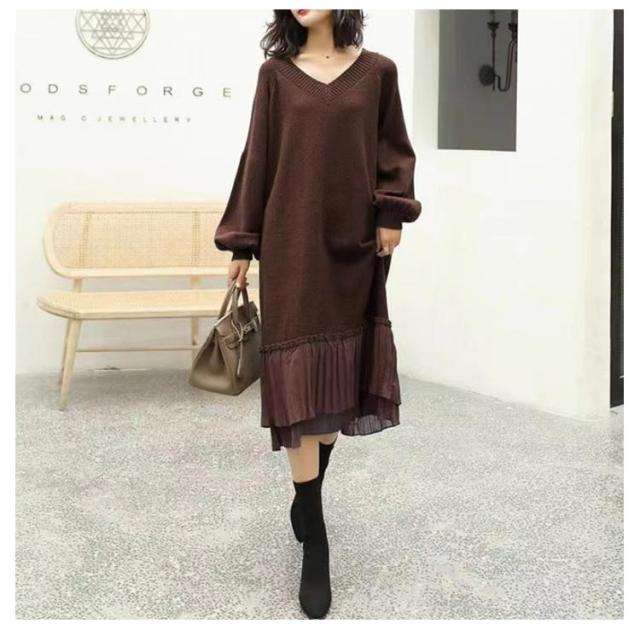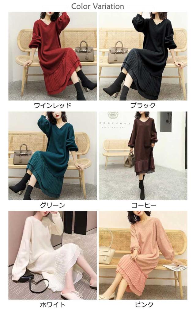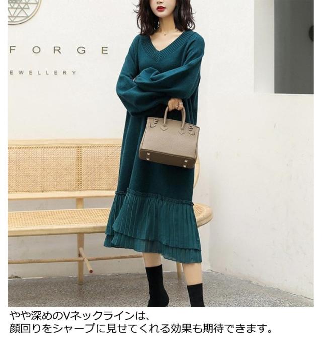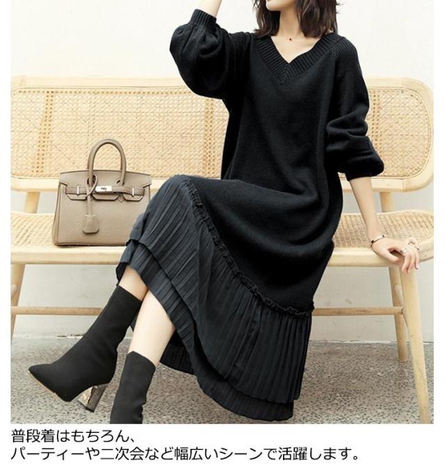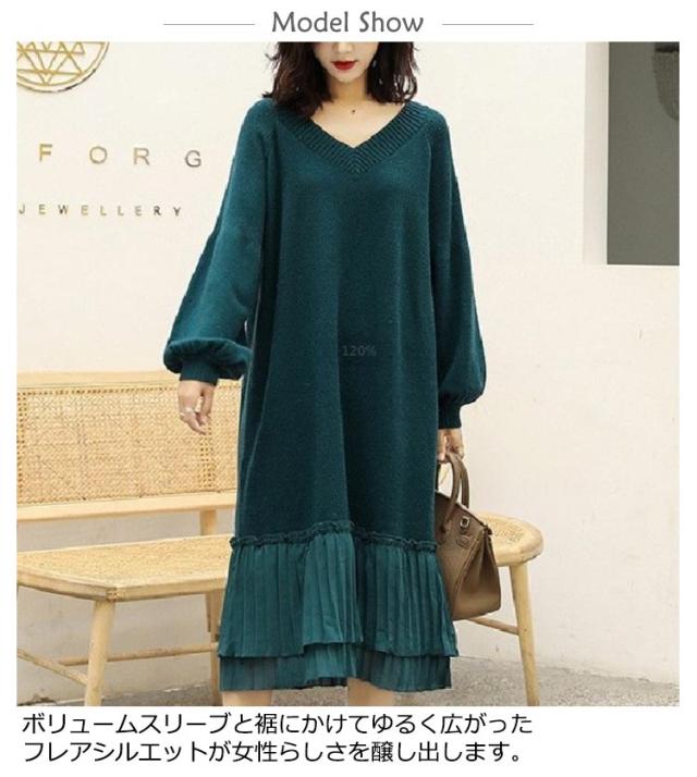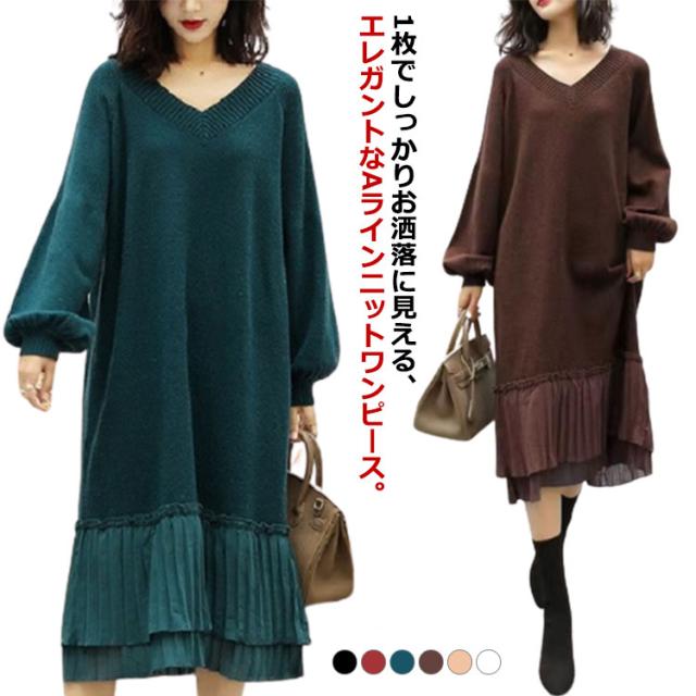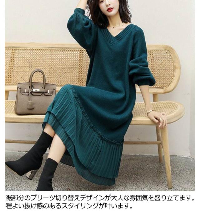 マキシワンピース 秋冬 ニットワンピ 切り替え ニット ニットワンピース Vネック ワンピース ロング丈 ゆったり Aライン レディース 裾 着痩せ きれいめ 可愛い ボリュームスリーブ バルーンスリーブ 重ね着 プリーツ 送料無料