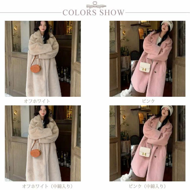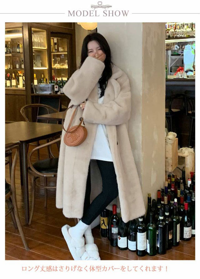 | 上品な光沢感としっかりとした厚みのある、ボリューミーで高級感のフェイクファーコートです。 ロング丈感はさりげなく体型カバーをしてくれます! オシャレ感もあり、キレイめからカジュアルまで幅広く合わせていただけます。 女性らしい魅力と可愛さを演出でき、暖かさと防寒性も叶える大活躍の一枚です。 | |