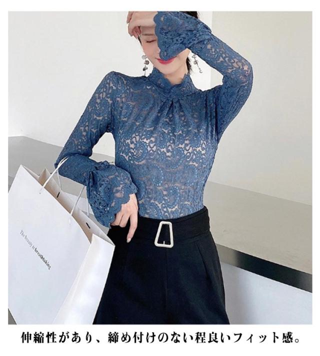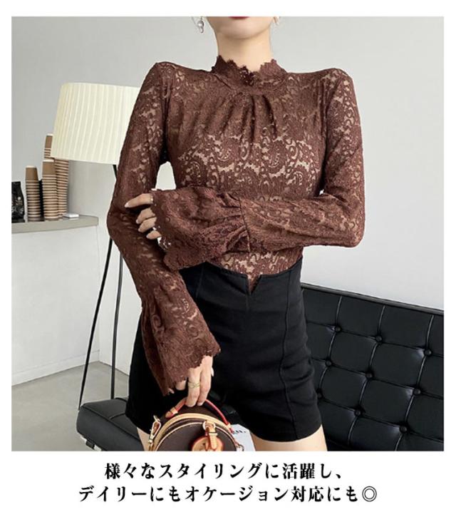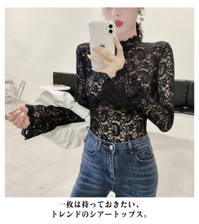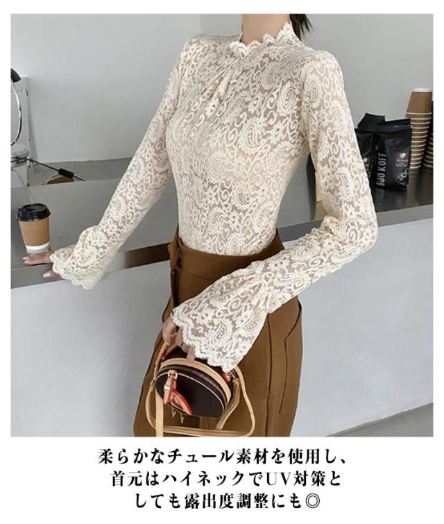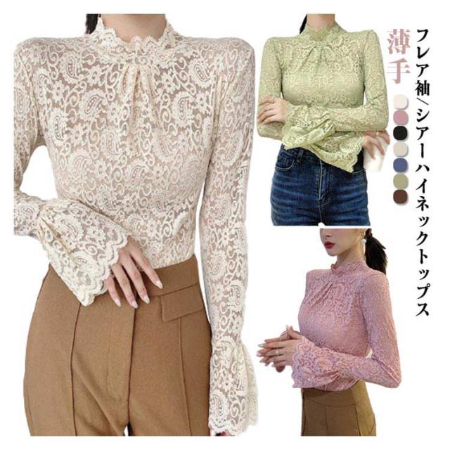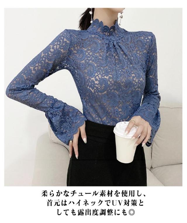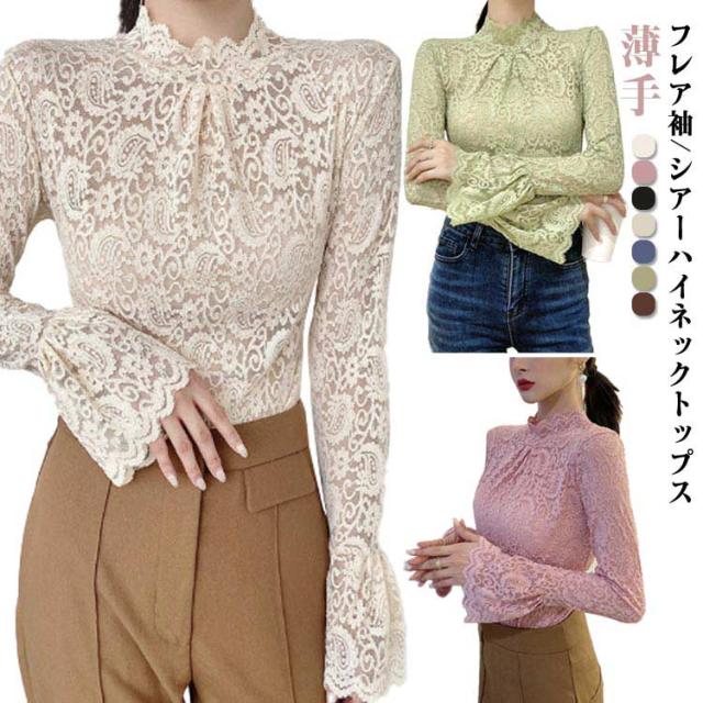 シアートップス レディース レース 長袖 ハイネック レーストップス 透け感 フレア袖 シースルートップス インナー 薄手 花柄 刺繍 レース レイヤード 重ね着 カジュアル きれいめ おしゃれ かわいい 春夏 秋冬 送料無料