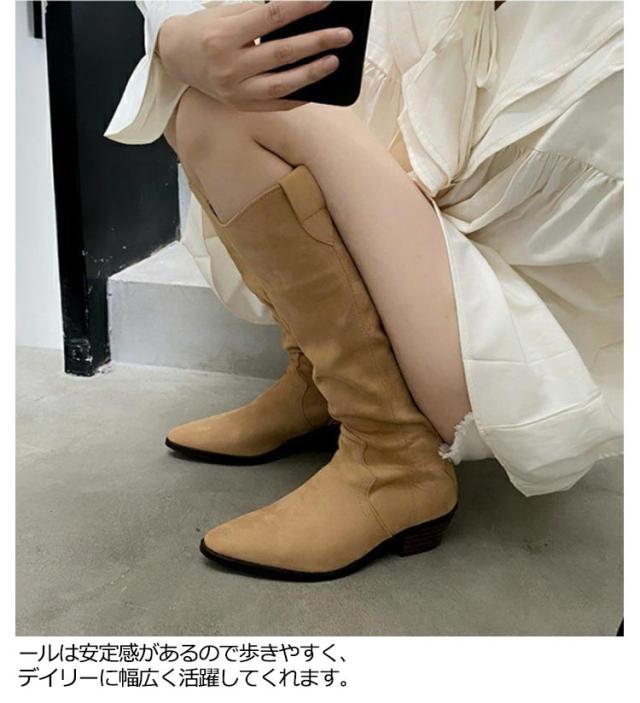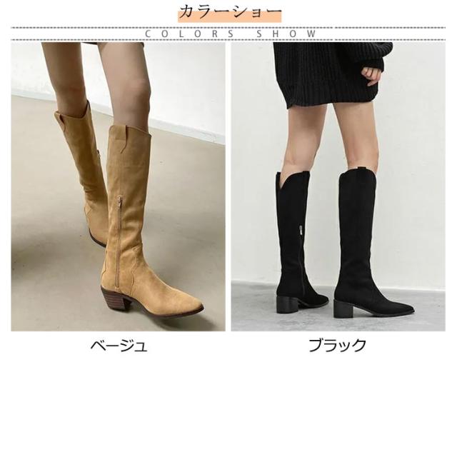 ロングブーツ ニーハイブーツ 美脚 ブーツ ローヒール スエード ポインテッドトゥ ウエスタン調 楽チン 大きいサイズ 痛くない スムース 細見せ 秋冬 疲れにくい カジュアル 送料無料