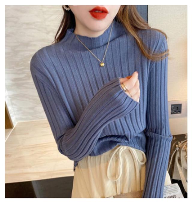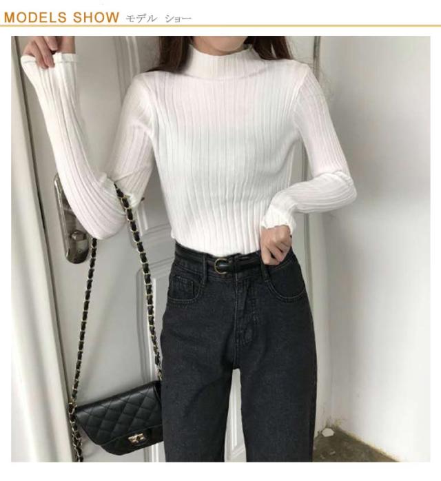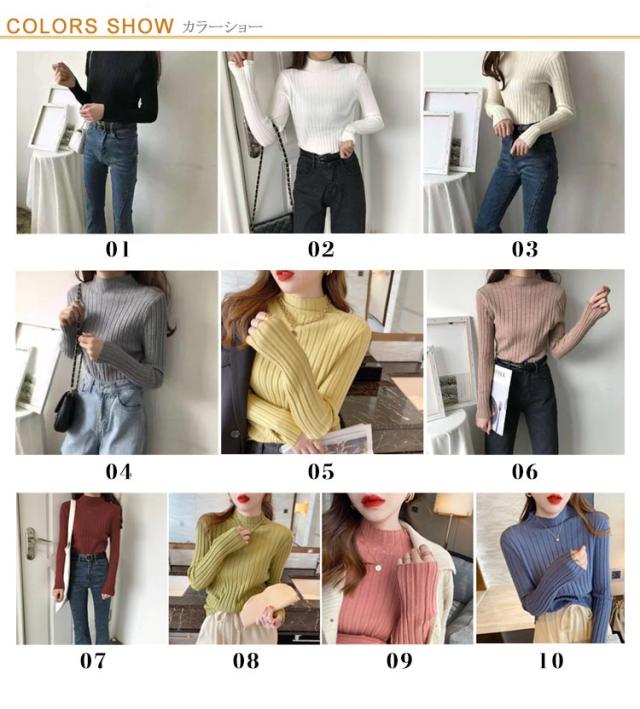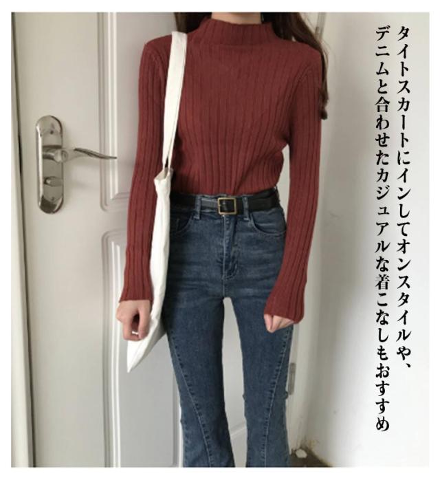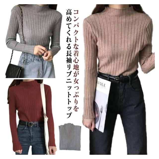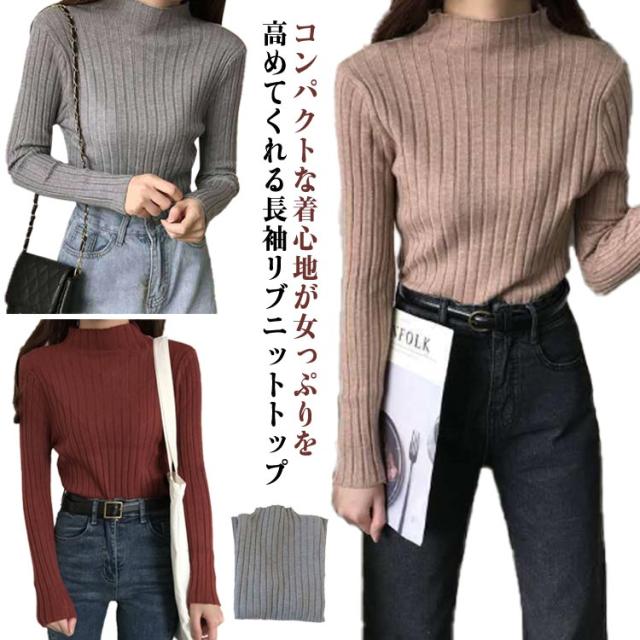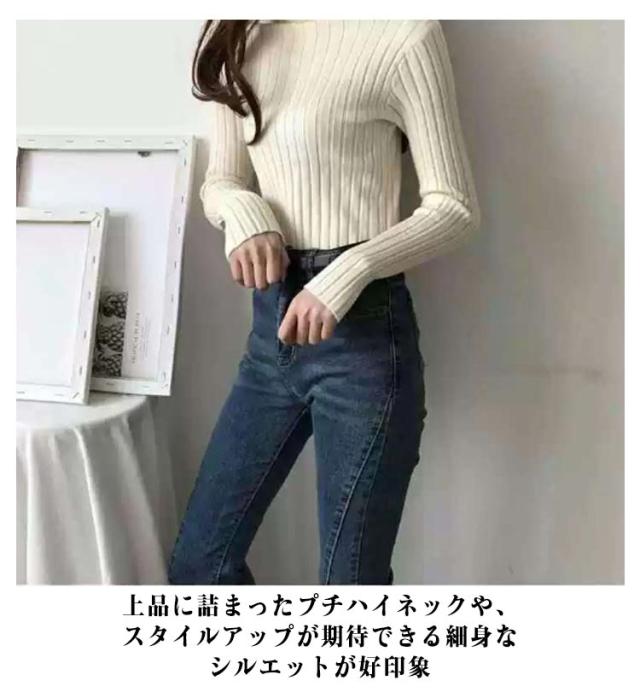 送料無料 プチハイネックニット プチハイネック ニットトップス レディース 長袖 カジュアル ニットソー 着回し 太めリブ タイト スリム 春 秋 冬 無地 ブラック ホワイト アイボリー ベージュ ブルー グレー