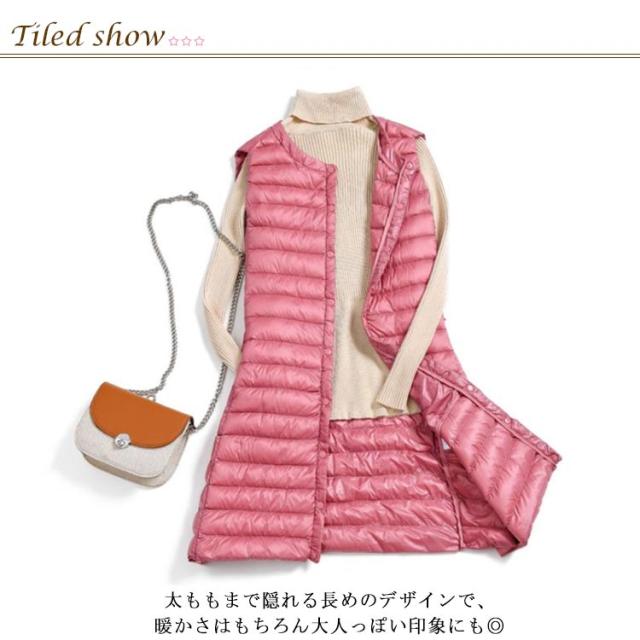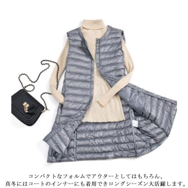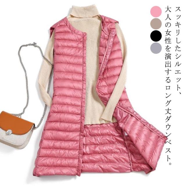 ダウンベスト ロング レディース ライトダウン インナーダウン ベスト ロングベスト スリム 秋冬 軽量 薄手 防寒 保温 あたっか 暖かい ノーカラー 襟なし ダウンジャケット ダウンコート ノースリーブ 大きいサイズ 大人 30代 40代 50代 60代 無地
