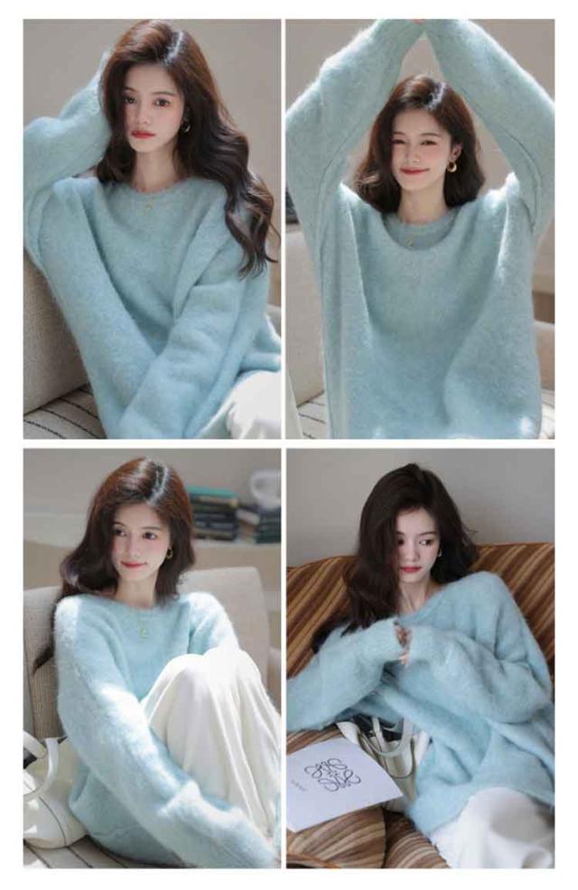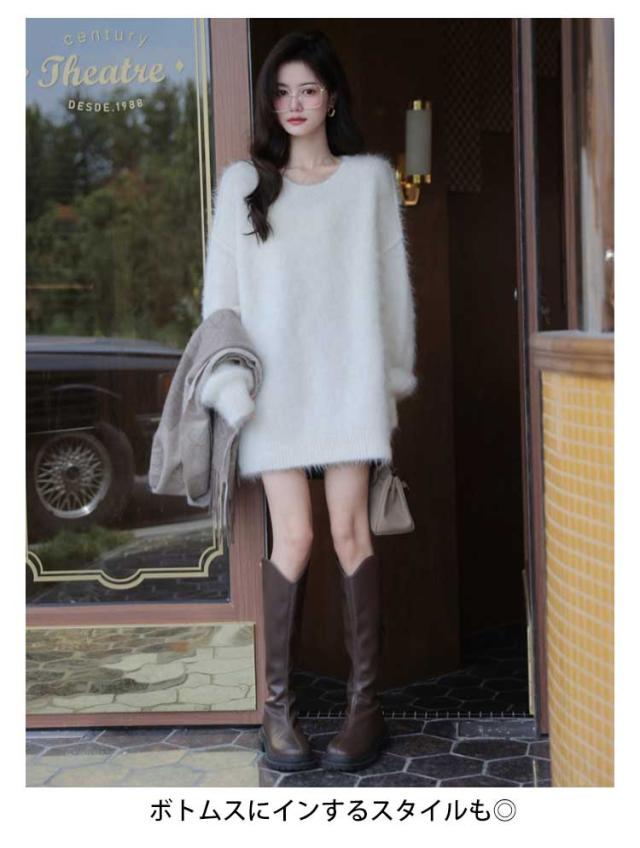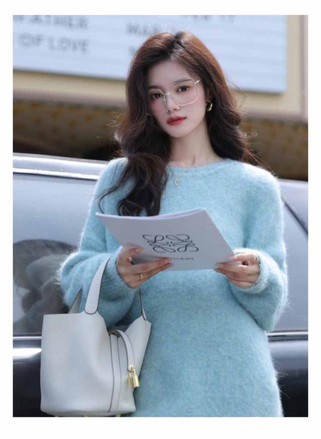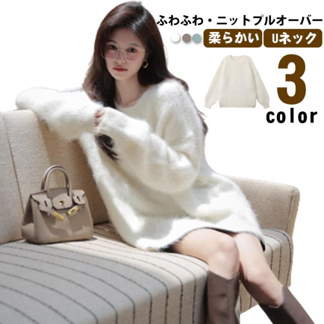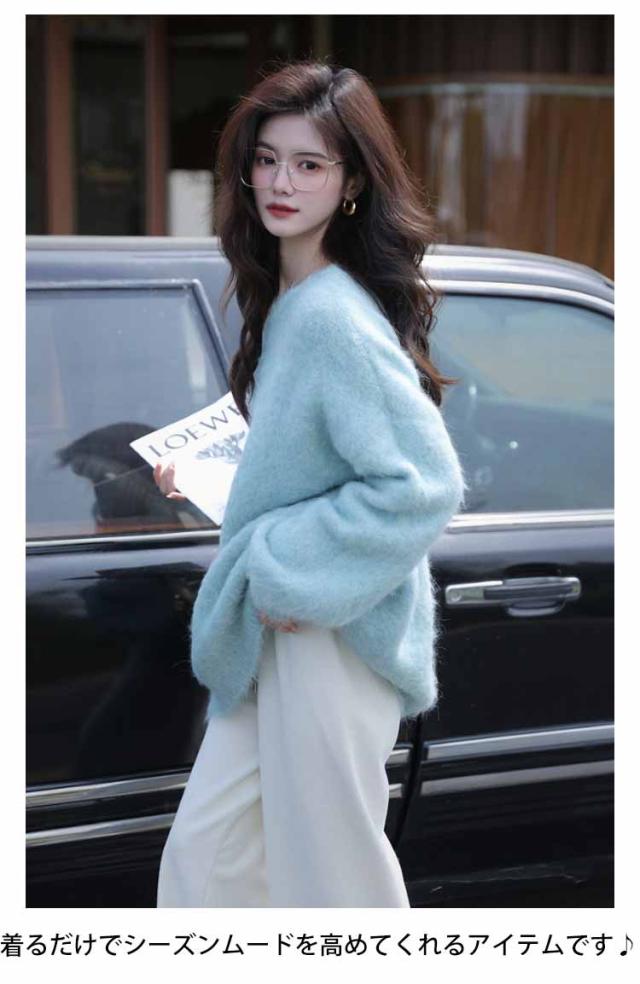 レディース プルオーバー 秋冬?ふわふわ?トップス 柔らかい?ブルー 大きいサイズ シャギーニット フェザーヤーン ニット オーバーサイズ Uネック セーター